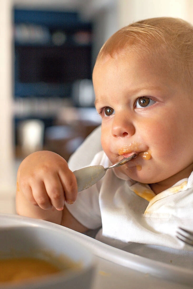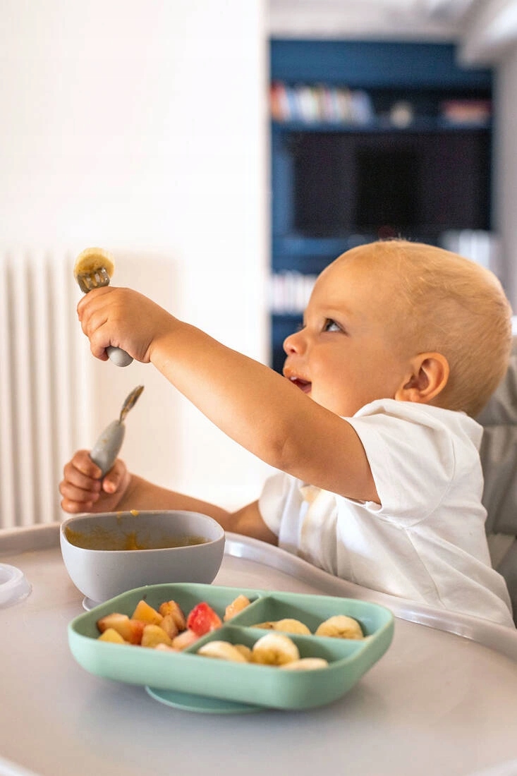 Сплощена форма ложки забезпечує оптимальні невеликі порції, які дитина легко ковтає, а вилка коротка, закруглені зуби для максимальної безпеки. Оскільки столові прибори мають однакову конструкцію та профіль з обох сторін, їх не потрібно повертати. Коротка заокруглена ручка з бічними поглибленнями дозволяє навчатися незалежному захопленню з 10-місячного віку (наприклад, долонею, пінцетом і кулаком). Вони підходять як для правшів, так і для ліворуких дітей.