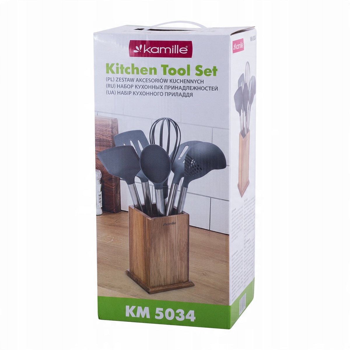 Кухонні аксесуари Kamille відрізняються сучасною формою та бездоганним виконанням. Виготовлений з високоякісної деревини, нержавіючої сталі та нейлону. Цей висококласний набір столових приладів зробить приготування різноманітних страв, варіння та розливання супу, збивання картоплі чи точніше подачу спагетті простіше та зручніше.