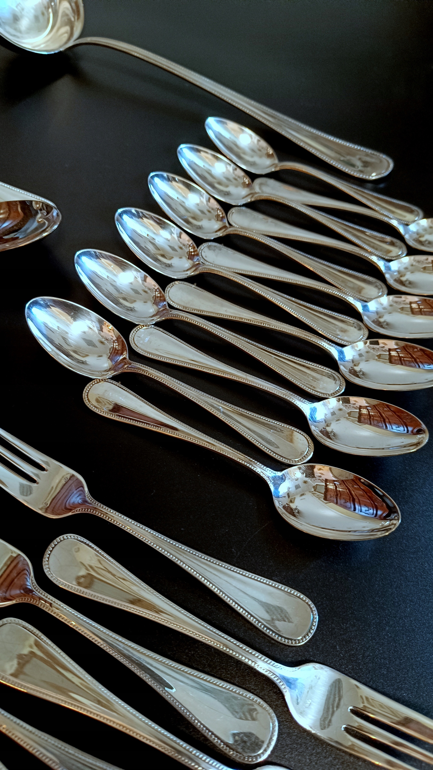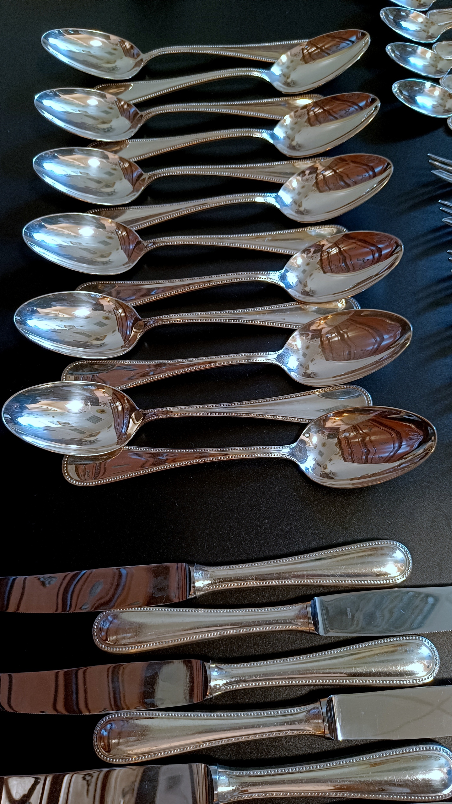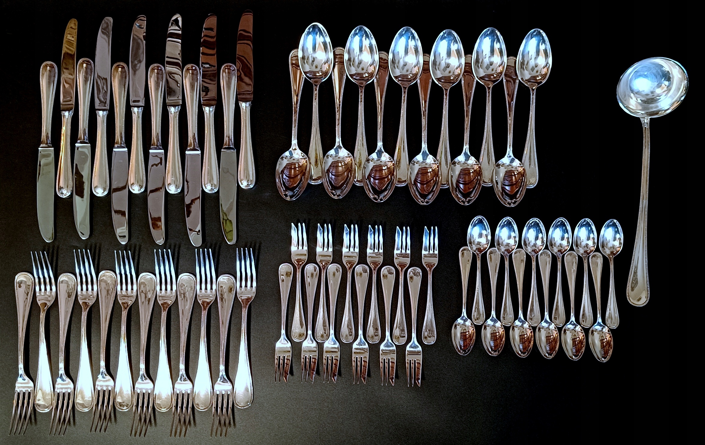 Набір складається з 1 ковду, 12 футболу, 12 вилків, 12 столових ложок, 12 чайних ложок та 12 вил. Кожен з художників має зламані панки з числом, що вказує на кількість срібла, що використовується до срібла до поверхні продукту. У цьому випадку Digit 120 на ковшах, вилки та ложки вказують 120 г на 24DCM2, що використовується сріблом. Однак ножі мають 27, чайні ложки 21 та виделки 18.