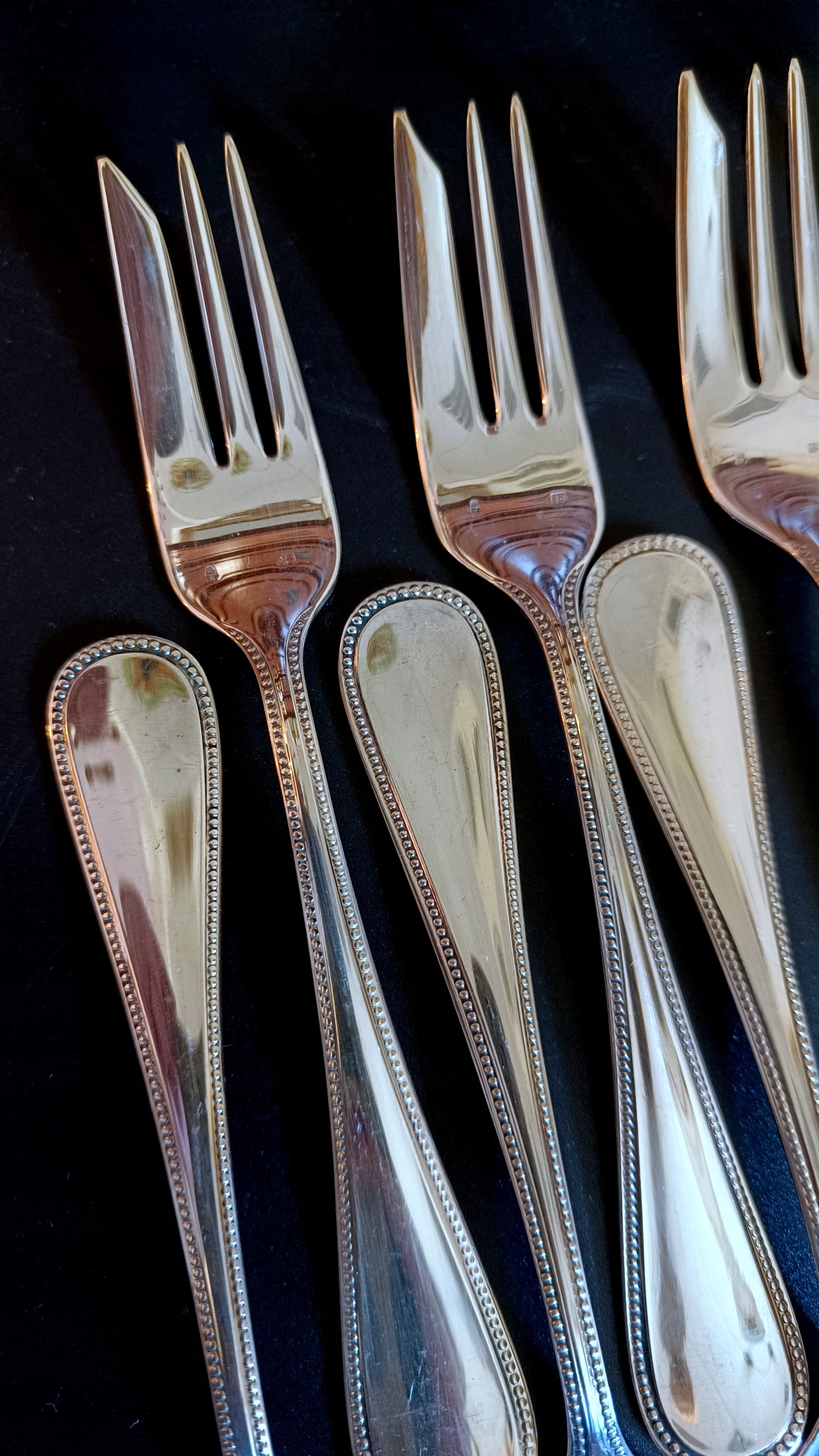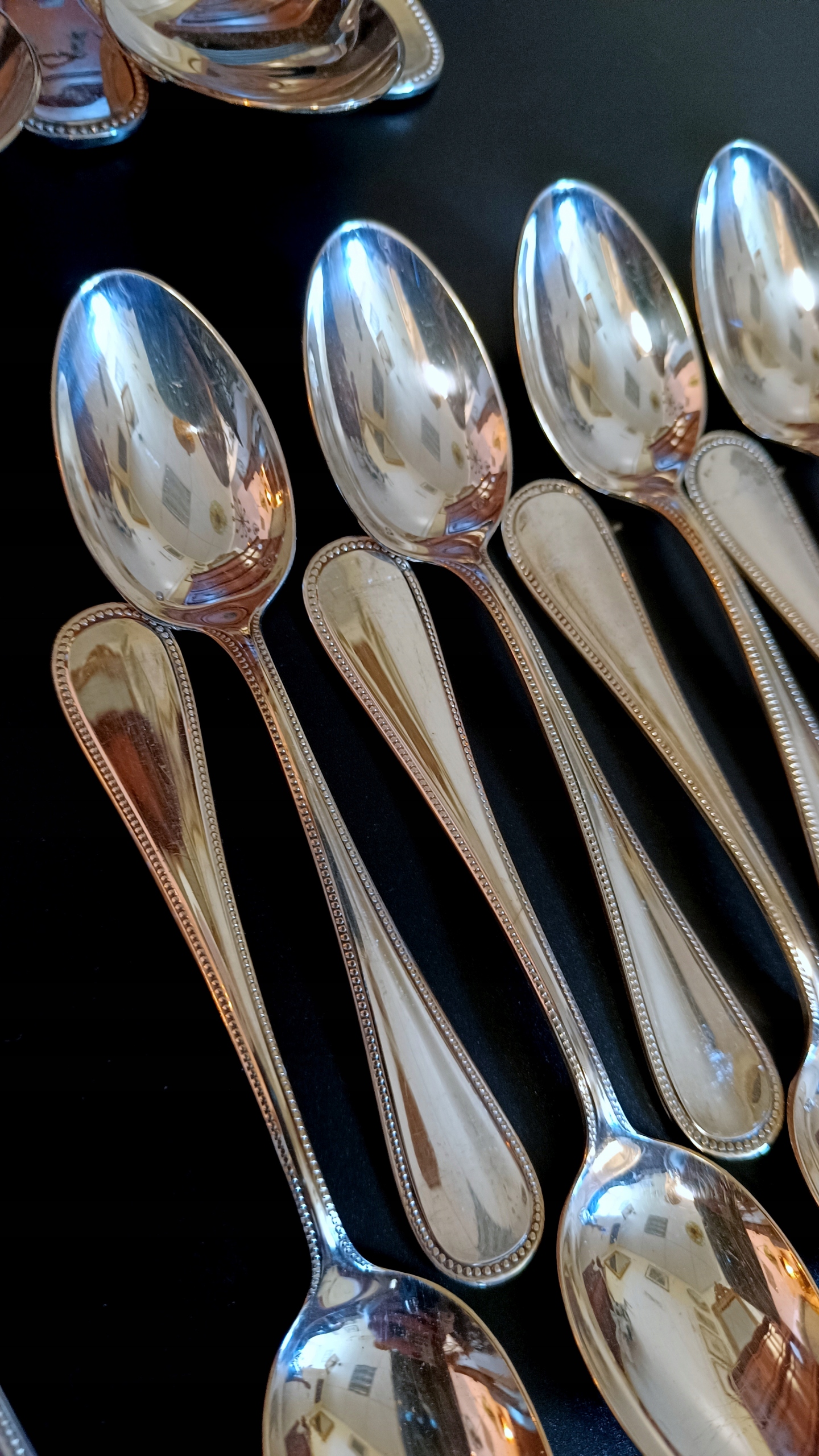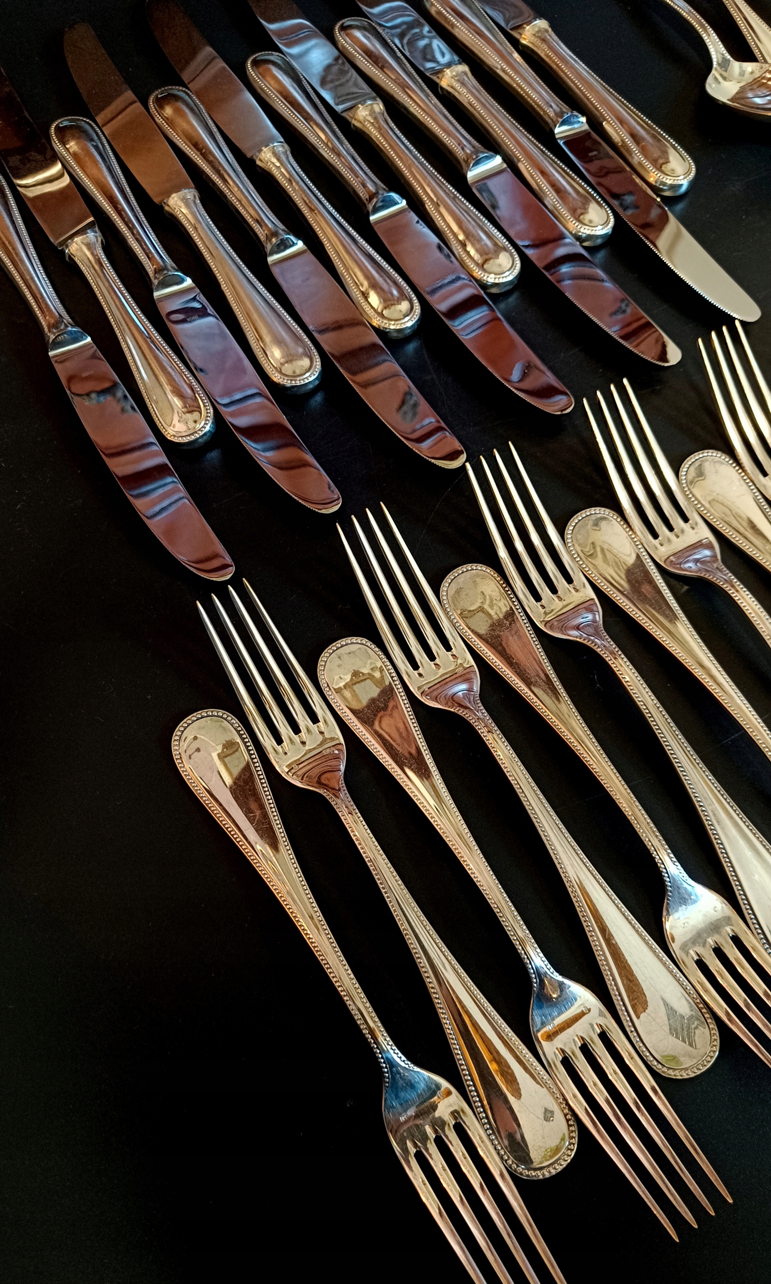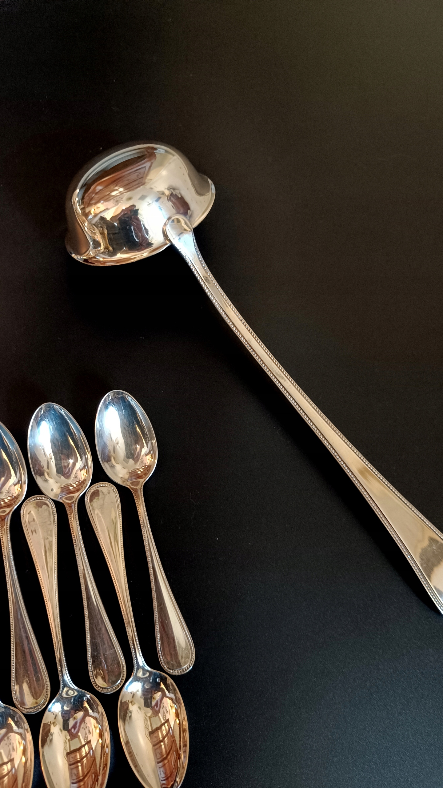 Набір складається з 1 ковду, 12 футболу, 12 вилків, 12 столових ложок, 12 чайних ложок та 12 вил. Кожен з художників має зламані панки з числом, що вказує на кількість срібла, що використовується до срібла до поверхні продукту. У цьому випадку Digit 120 на ковшах, вилки та ложки вказують 120 г на 24DCM2, що використовується сріблом. Однак ножі мають 27, чайні ложки 21 та виделки 18.