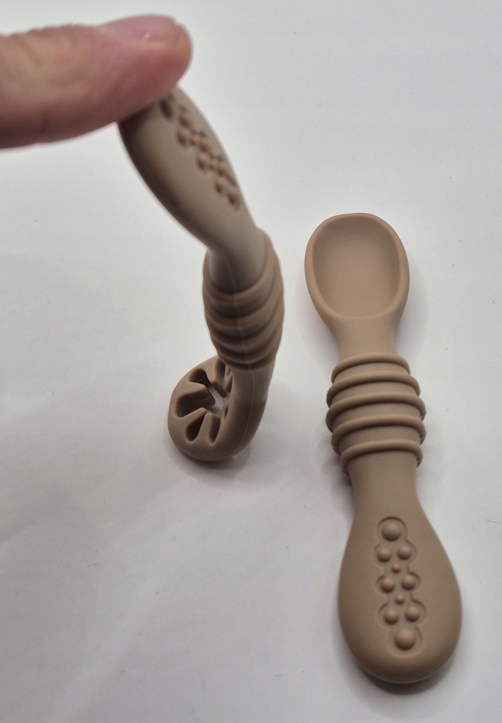 Відкрийте для себе наші інноваційні силіконові столові прибори, розроблені спеціально для найменших! Виготовлені з безпечного матеріалу без бісфенолу А та ергономічної форми - вони ідеально лягають у маленькі ручки. Легко чистяться та доступні в яскравих кольорах, вони перетворюють навчання самостійного прийому їжі на гру для вашої дитини.
