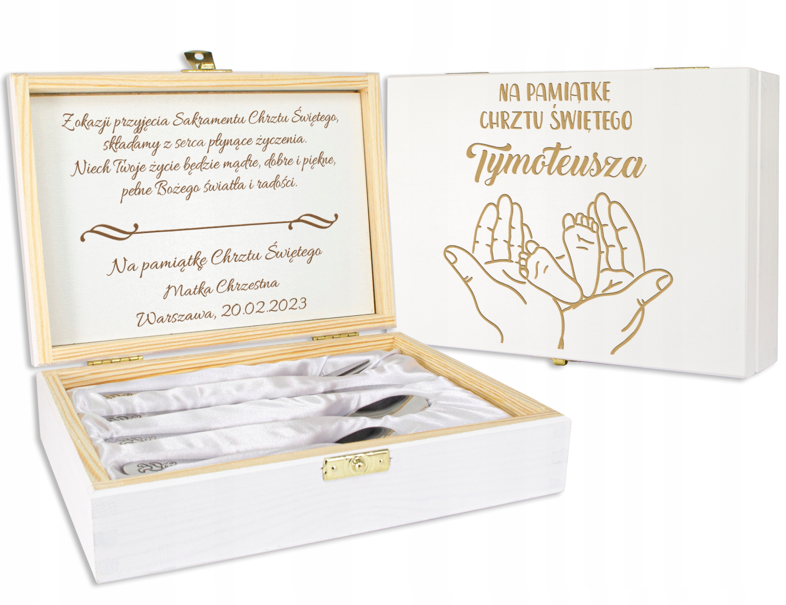 БІЛА СКОРОБКА ДЛЯ ХРИЩЕННЯ З ГРАВІЮВАННЯМ ЗІ СТОЛОВИМИ ПРИБОРАМИ