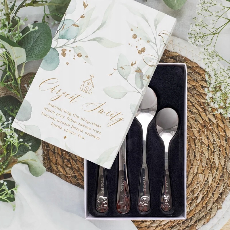 Столові прибори для хрещення, поміщені в спеціальну коробку , це унікальний набір, який буде додатково прикрашений ім'ям дитини. Кожен елемент набору також має опуклі візерунки у формі чотирьох різних тварин. Столові прибори виготовлені з нержавіючої сталі. Також варто звернути увагу на багато декоровану зовнішню упаковку, на якій містяться побажання, що стосуються таїнства хрещення.