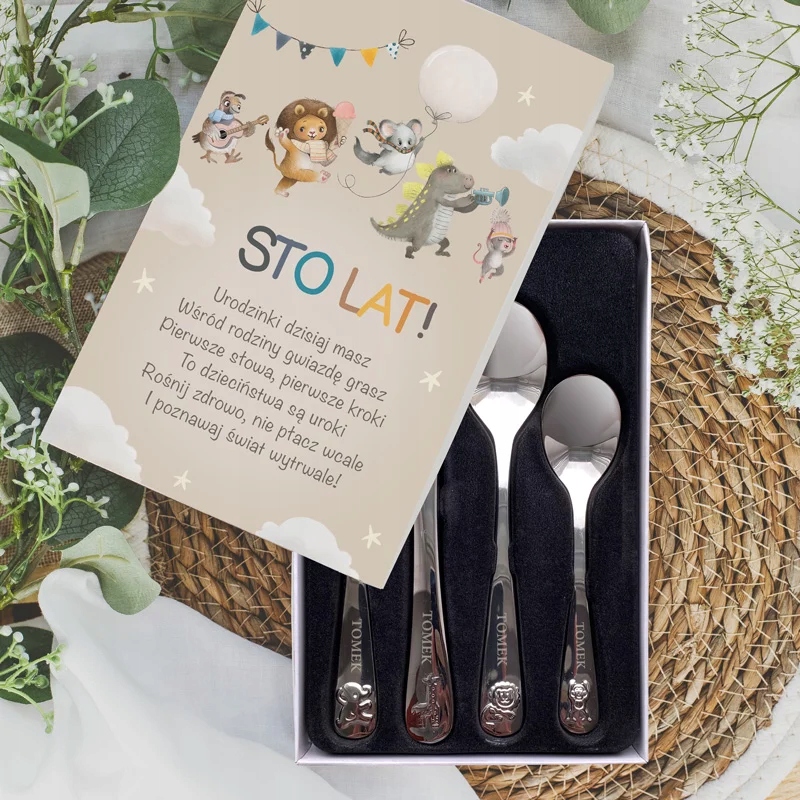 Кожна з них виготовлена з високоякісної нержавіючої сталі та має вигравірувану назву. Крім того, кожен столовий прилад має опуклий декор із зображенням однієї з чотирьох різних тварин. Все це елегантно упаковано в барвисту коробку з привабливою графікою та побажаннями до дня народження на кришці.