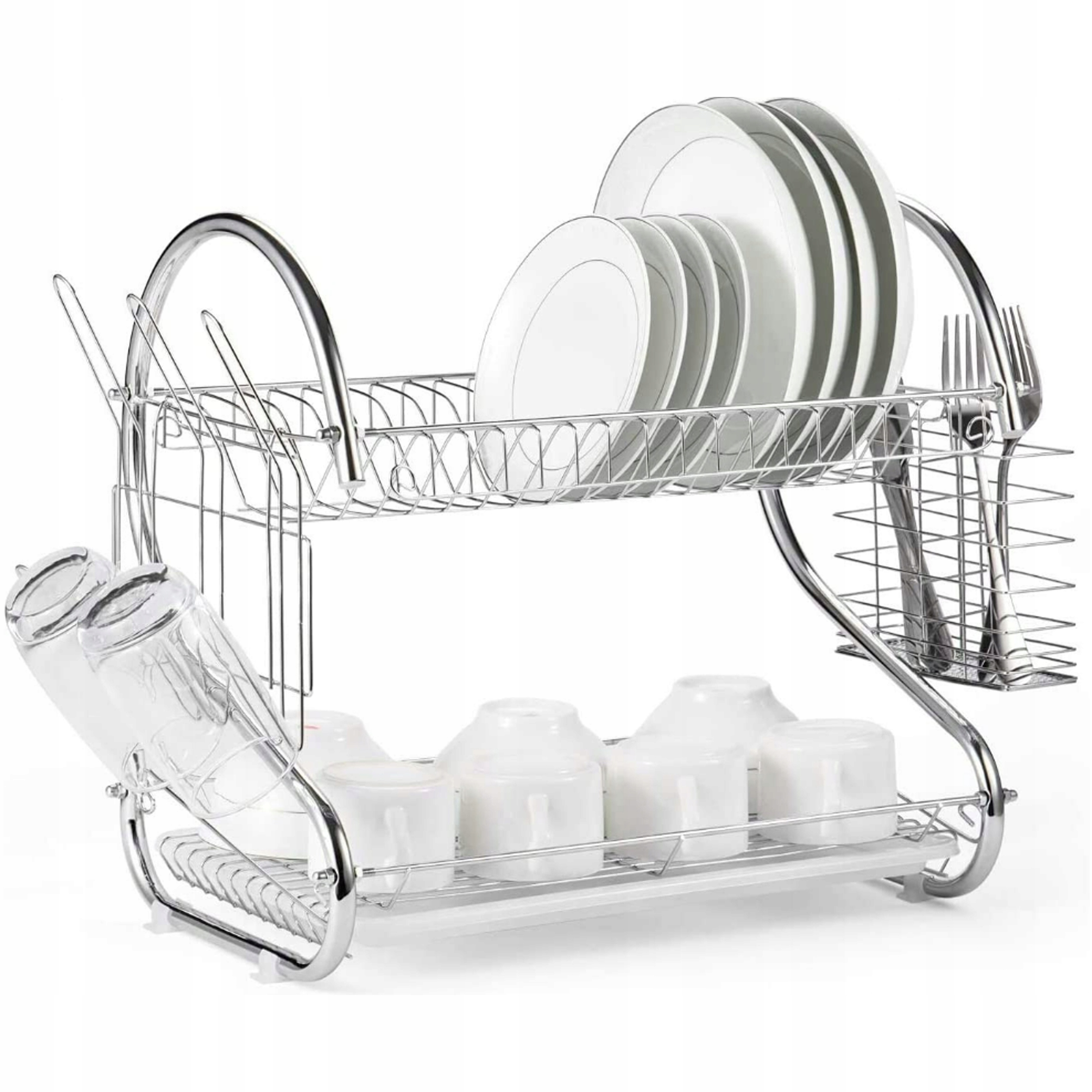 Верхній рівень ідеально підходить для сушіння великого посудуабо тарілки, а в нижній розмістяться невеликі контейнери, блюдця або чашки. Завдяки своїй конструкції з міцного хромованого дроту пристрій прослужить багато років.