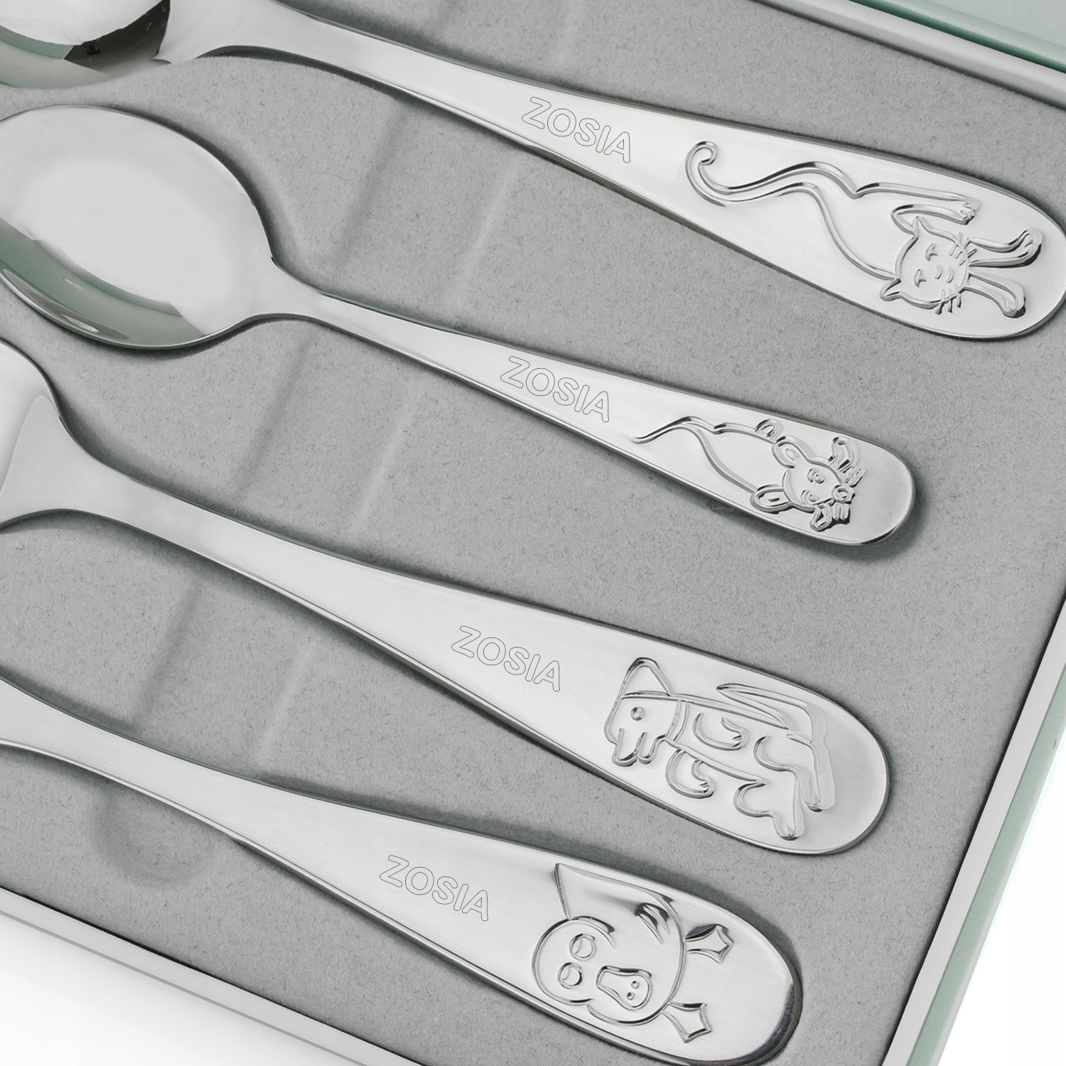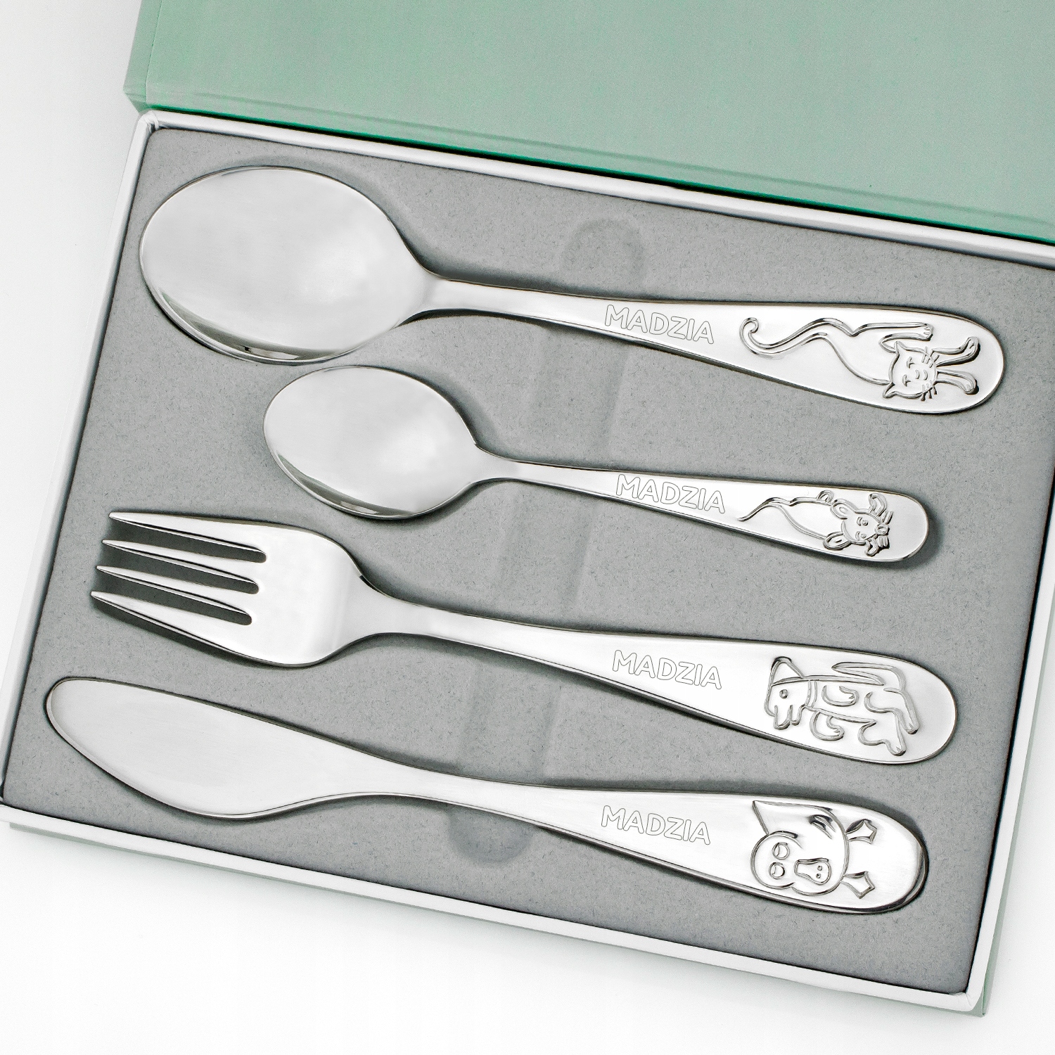 Набір із 4 столових приборів, створений спеціально для дітей, стане чудовим подарунком на Святе Хрещення або перший день народження. Завдяки адаптації ваги та розміру столового приладу до руки дитини, він ідеально сидить і не створюватиме жодних проблем у користуванні малюків.