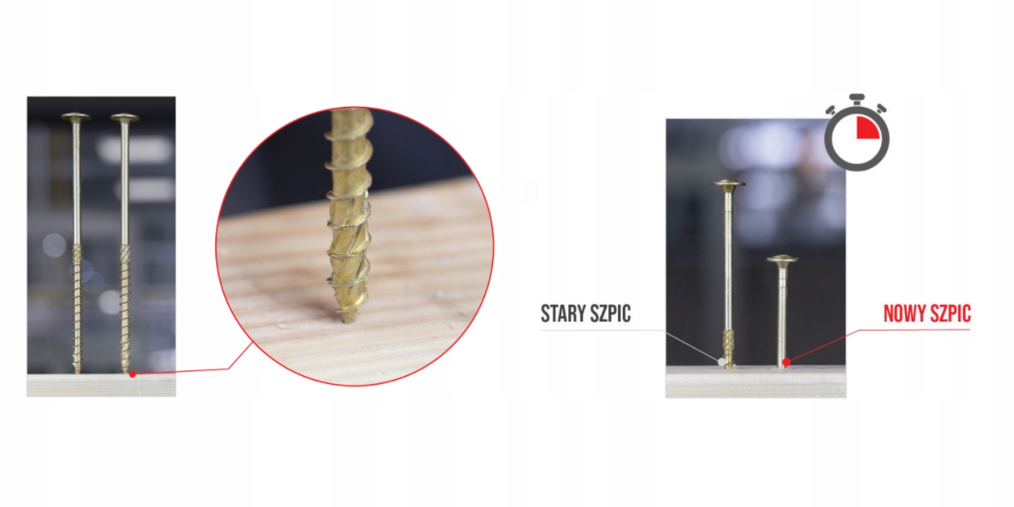 Випробування продукту підтвердили, що новий наконечник гвинта скорочує час загвинчування до 40% при тому самому навантаженні. Економія часу залежить від типу з’єднання та використовуваної деревини.