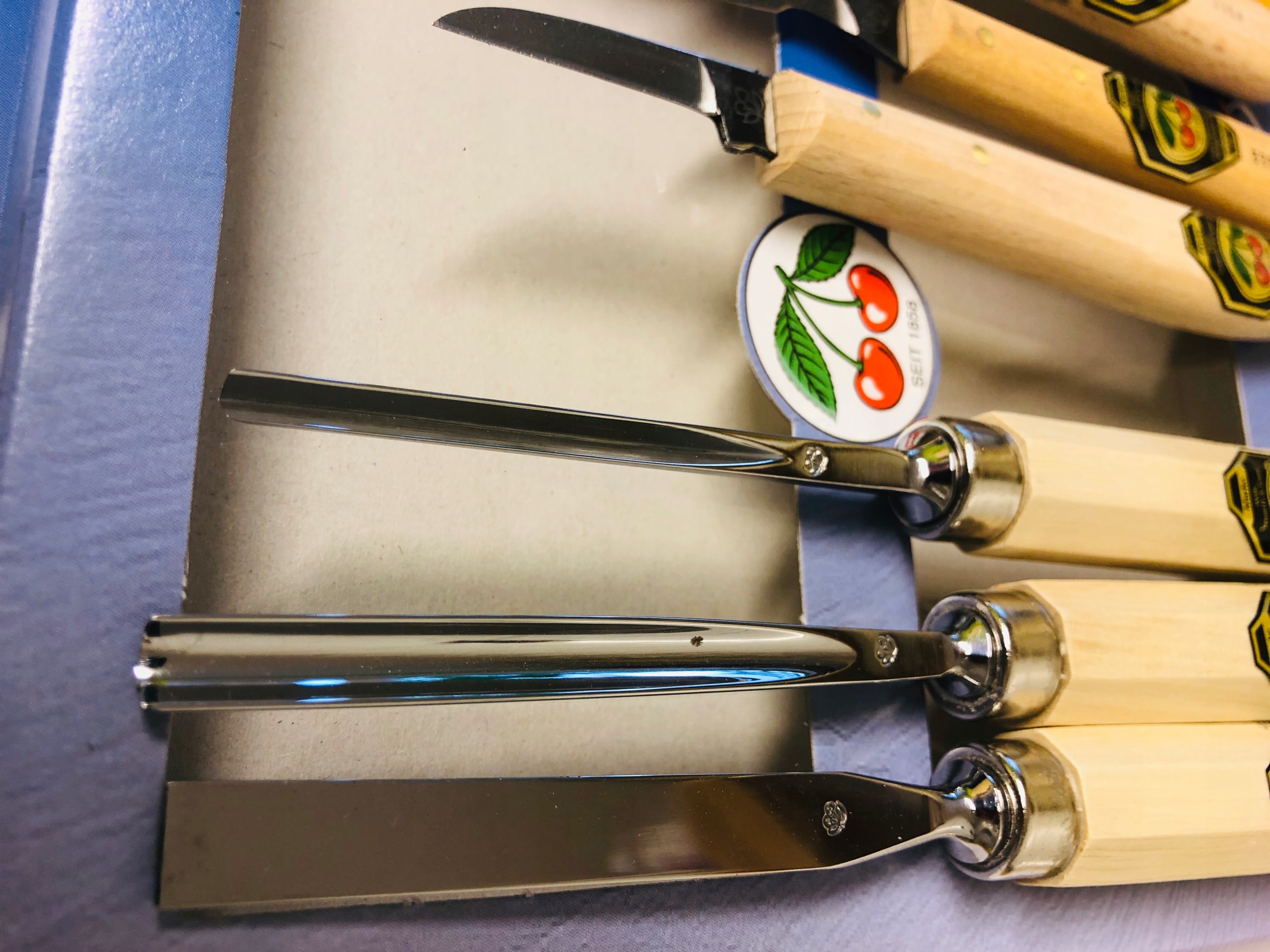Усі типи зубил (міцніші долота, а також долота для різьблення та точіння) з високовуглецевої сталі, вони загартовані в соляній ванні. З твердістю 61 HRc по всій корисній довжині (2/3 леза) інструменти перевищують специфікації DIN.