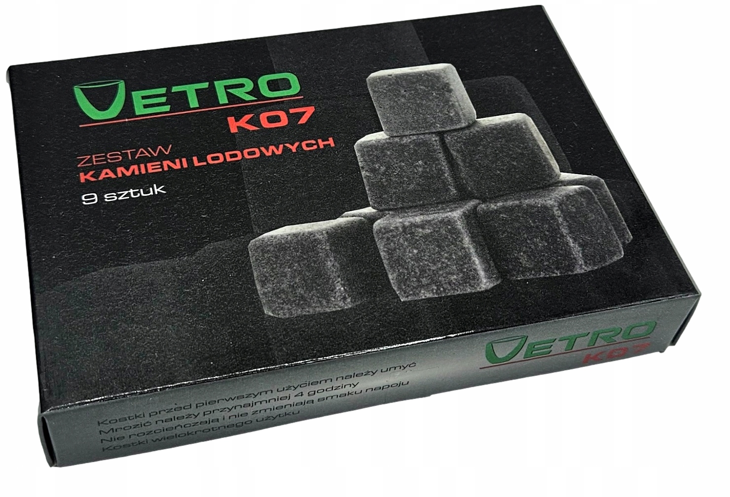 Набір кам'яних кубиків льоду для охолодження напоїв і напоїв. На відміну від своїх класичних побратимів, ці гранітні кубики не змінюють якості напою, а отже дозволяють насолодитися його смаком у повній мірі. Вони довговічні, абсолютно безпечні для здоров'я і можуть використовуватися багаторазово.