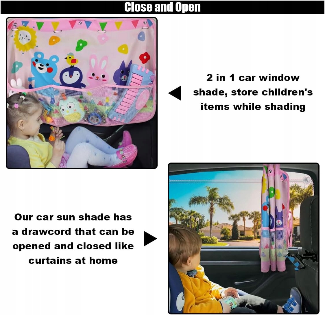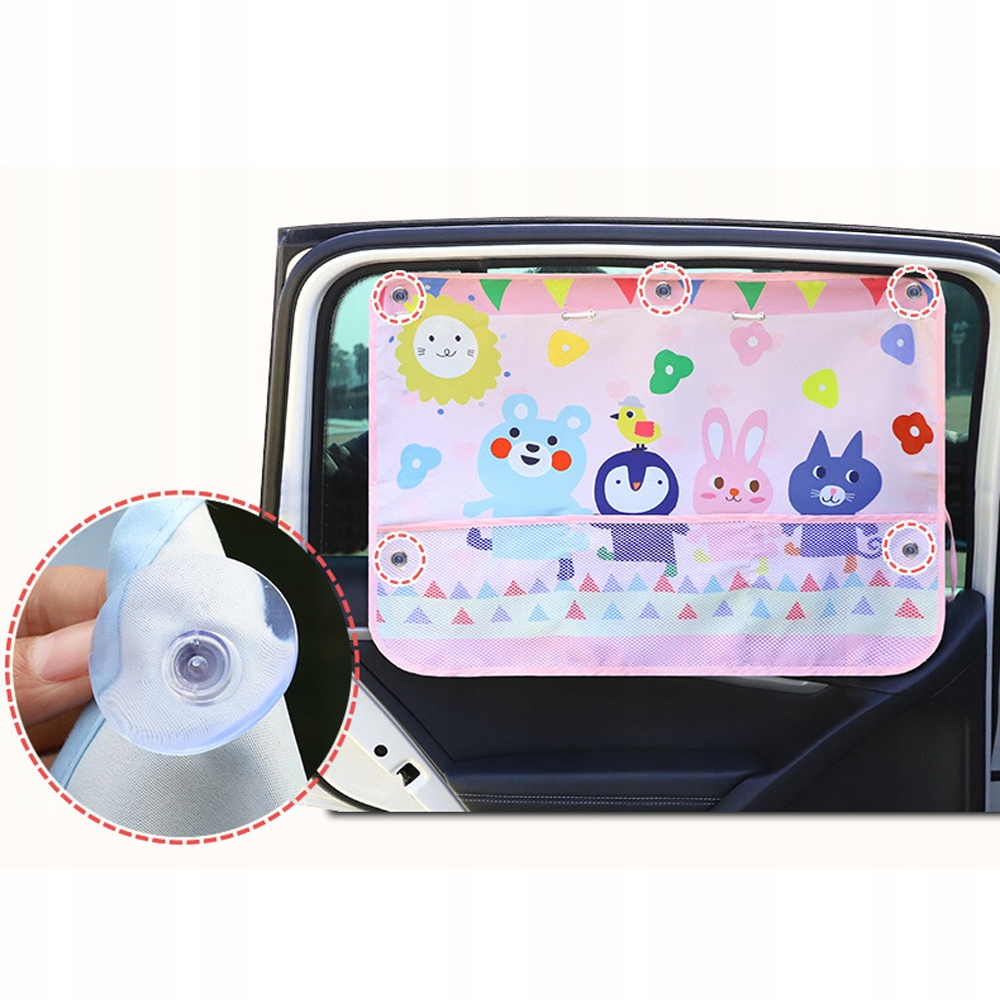Сонцевий козирок був розроблений із чарівними конструкціями мультфільмів, які можуть привернути увагу дітей та зробити їх подорож приємнішою. Крім того, він оснащений сітчастими мішками, які можуть зберігати закуски, пляшки, маленькі іграшки, пляшки з водою, рушники та інші дрібні предмети.