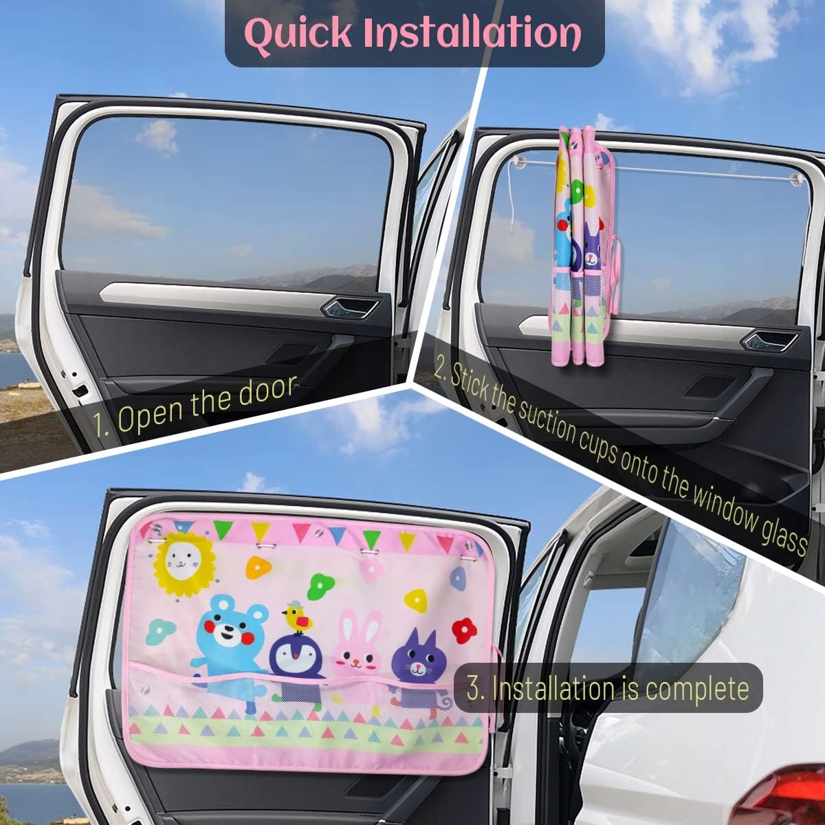 Сонцевий козирок для немовлят для немовлят оснащений 5 сильними присосними чашками , які можна міцно прикріпити до склянки автомобіля і його нелегко впасти, і його можна легко встановити без будь -яких інструментів. Крім того, також оснащений рядком , яку можна встановити на обох кінцях вікна з двома присосними чашками, а можна перемістити ліворуч і вправо між Welt, як домашня завіса .
