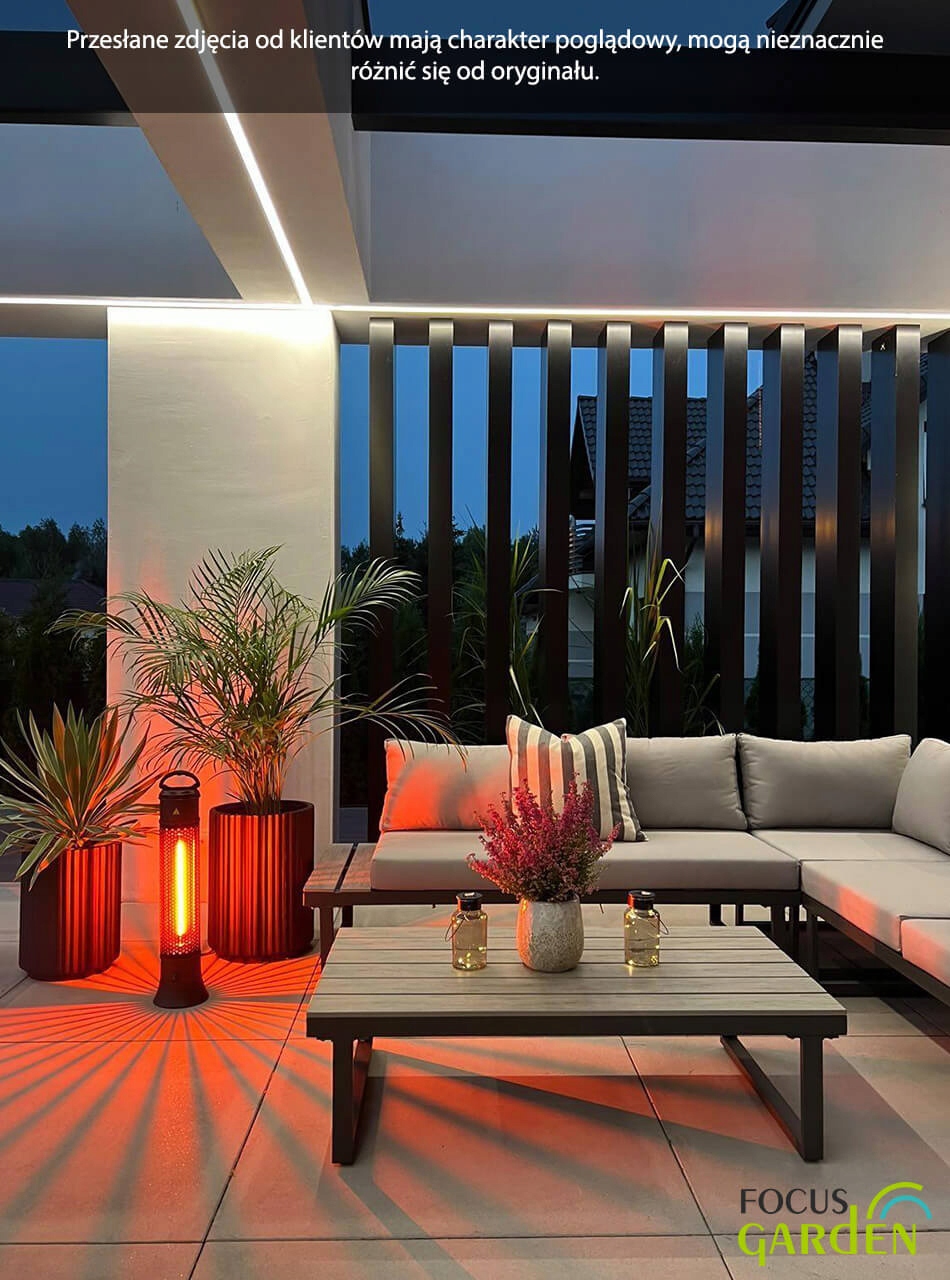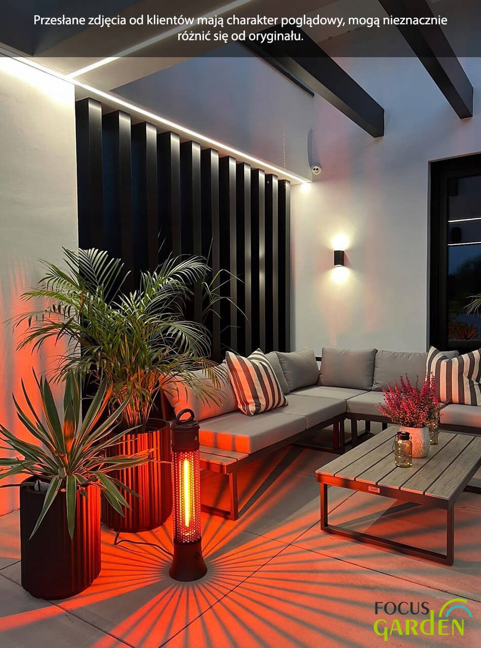 Променевий обігрівач Apus дуже ефективний, а панорамне ядро забезпечує 360- ступінь нагріву. Інфрачервоний колонний обігрівач має компактні розміри, але працює дуже ефективно. Збирати не потрібно - просто розмістіть його будь-де, на рівній поверхні. Завдяки ручці його легко переносити навіть під час роботи. Прилад автоматично вимикається, якщо він перекидається. Серцевина захищена спеціальною сіткою, яка не нагрівається. Завдяки цьому радіатор можна безпечно використовувати практично в будь-якому місці. Модель Apus виготовлена з міцних матеріалів: сталі, заліза та алюмінію, тому вона легко прослужить вам довгий час. Він має просту, елегантну форму, яка не порушить архітектуру саду чи тераси. Він також водонепроникний (IP55), тому його можна використовувати в різних умовах. Виберіть електричний обігрівач Apus і забезпечте собі та своїм гостям винятковий комфорт навіть при низьких температурах!