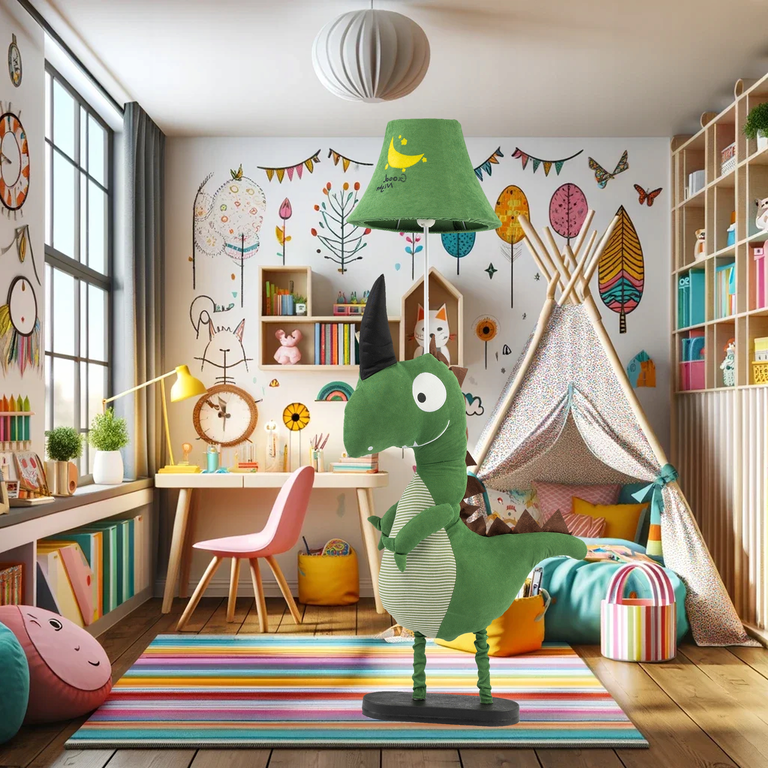 Зелений динозавр з чорним кутом та животом у смугах - це не лише лампа, але й унікальний декоративний елемент, який негайно приваблює. Його унікальний стиль і чарівність роблять його улюбленим як дітей, так і дорослих. Ця стояча лампа підлоги ідеально впишеться в будь -який інтер’єр, додаючи трохи магії та позитивної енергії.