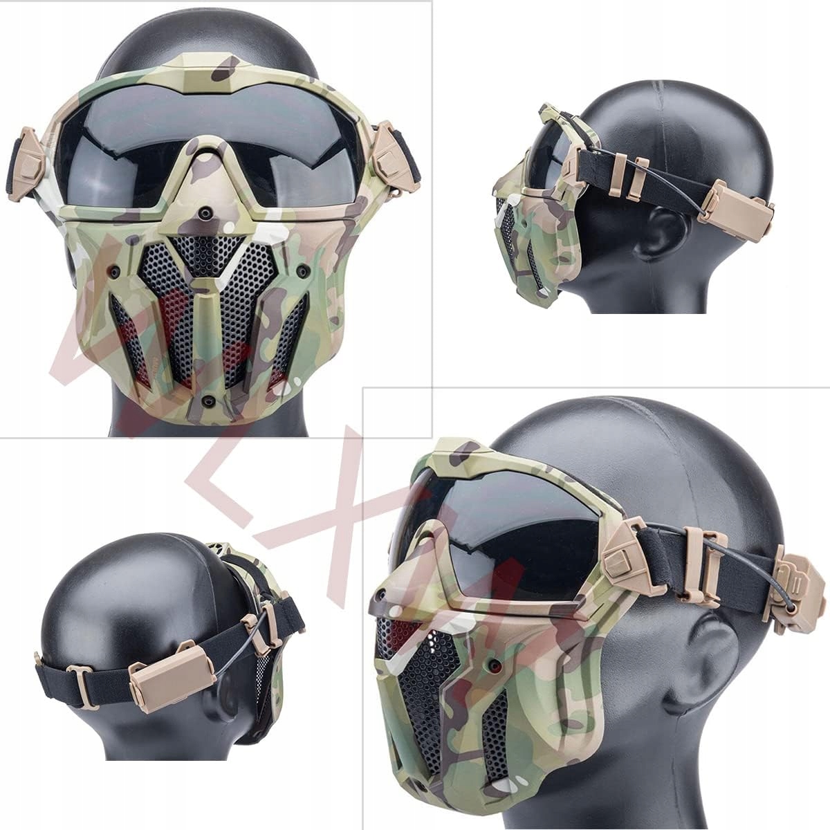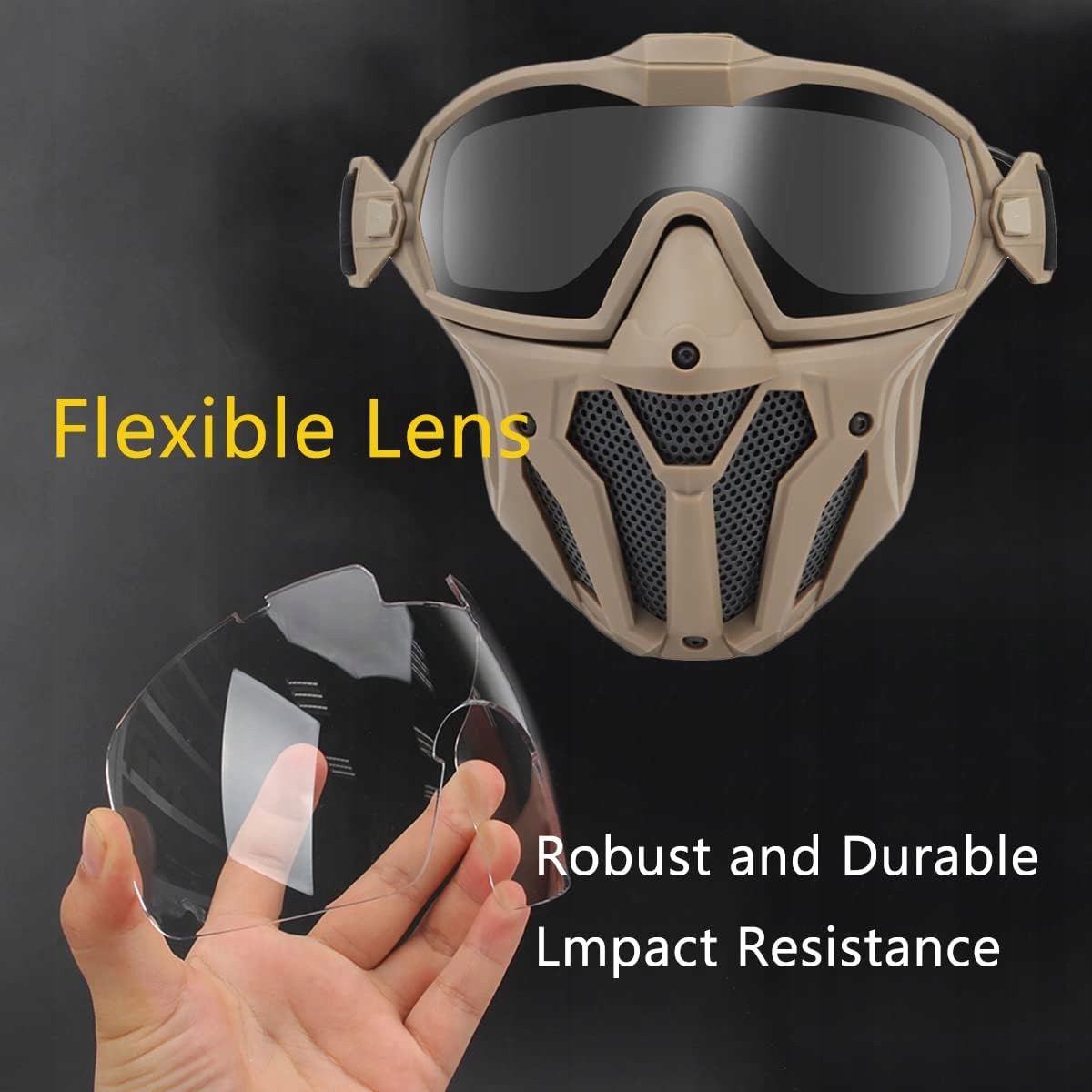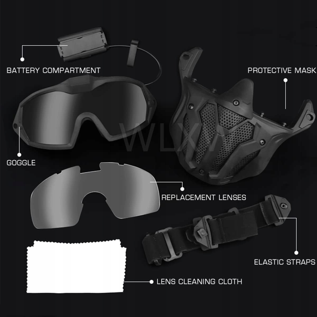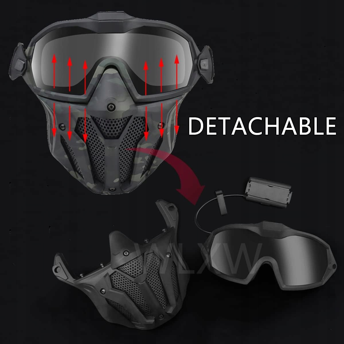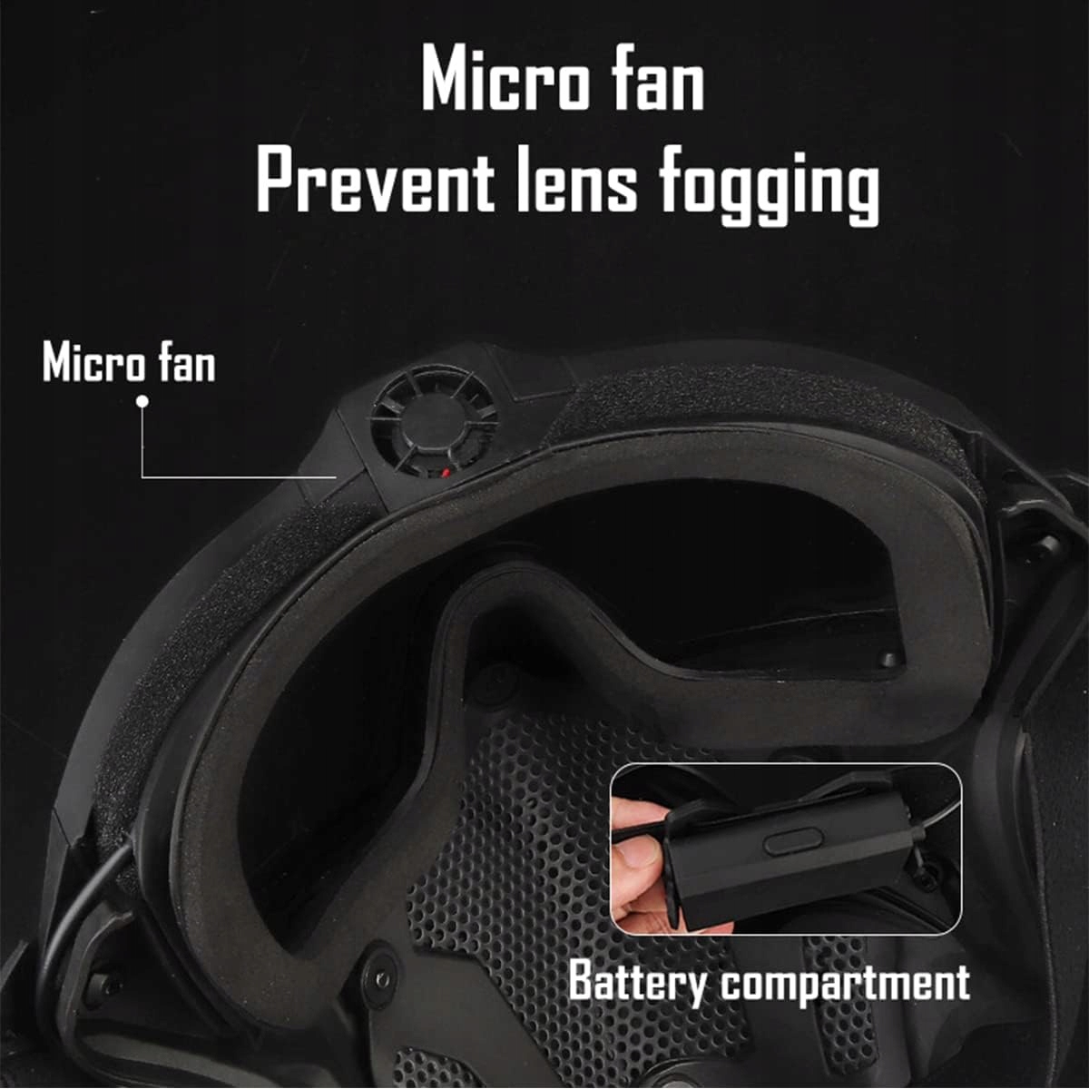 Знімна тактична маска та окуляри можна розділити. Тактична маска виготовлена з натурального каучуку і має якісну, дихаючу, високу повітропроникність, корисна для здоров'я та нешкідлива. Окуляри оснащені вибухозахищеними лінзами ПК, мають захист від запотівання та ультрафіолетового випромінювання, мають високу міцність, їх нелегко зламати. Змінний об'єктив Виріб оснащено двома об'єктивами. Прозорі лінзи використовуються в приміщенні в похмурий день, а затемнені лінзи використовуються під гарячим сонячним світлом. Вбудований вентилятор проти запотівання, який виштовхує вологе повітря зверху, щоб вирішити проблему окулярів, спричинену тривалим запотіванням маски. Вентилятор має два режими швидкості. Він живиться від 2 батарейок типу ААА та має кнопку ввімкнення/вимкнення, якою можна керувати на свій вибір.