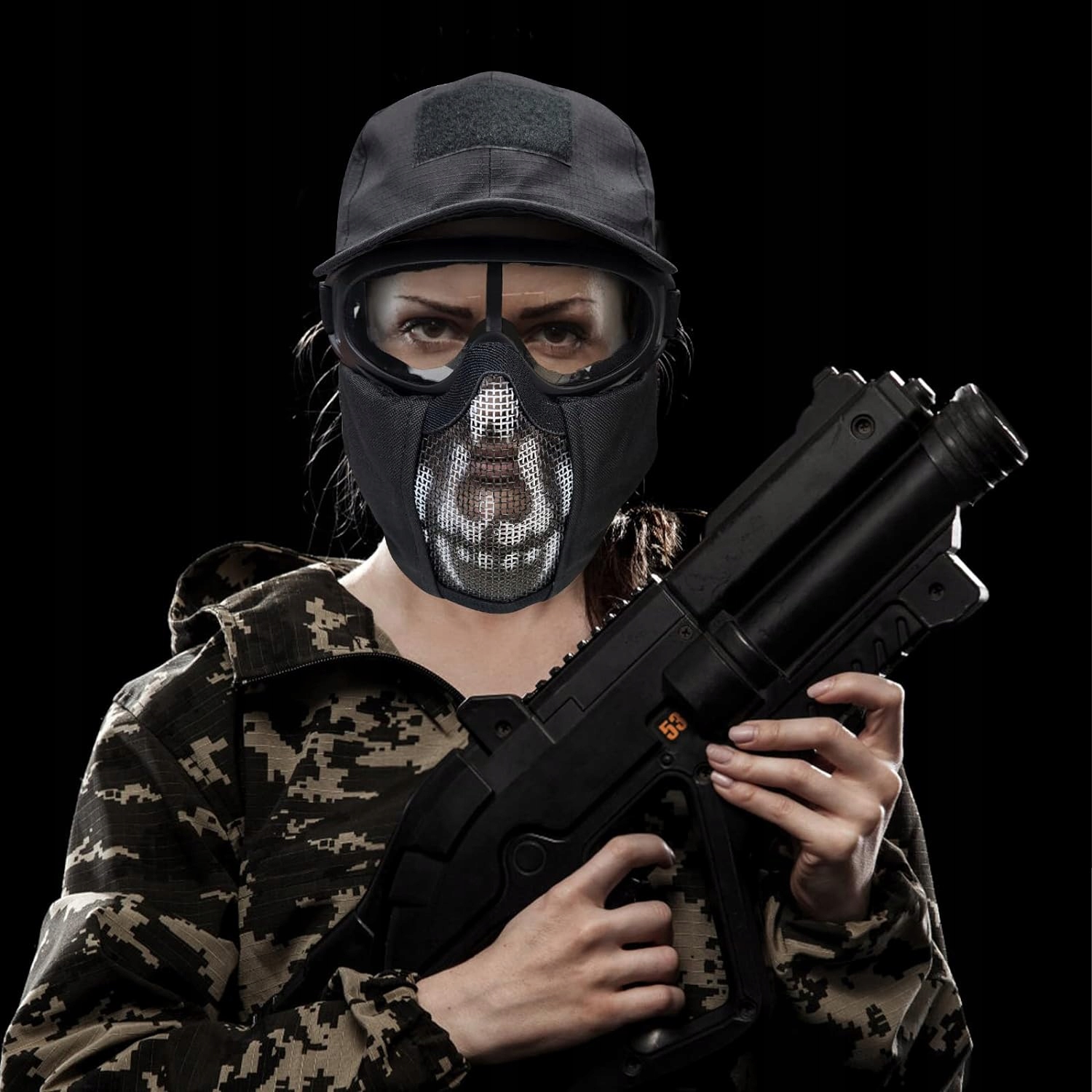 Матеріал Страйкбольна маска з низьковуглецевої сталі та нейлону 1000D, високоякісна та міцна. Окуляри виготовлені з ABS-пластику, сополімеру акрилонітрилу-бутадієну-стиролу, стійкі до ударів і можуть забезпечити достатній захист для публіки зі швидкістю нижче 310 fps на відстані 5 метрів. Бейсбольна кепка з липким кільцем, в комплекті є 1 шт. Цей продукт являє собою повний набір аксесуарів для захисту голови для ігор із пневматичною зброєю. Зручні та регульовані, на масці є 2 регульовані еластичні ремені, які підходять для різних розмірів голови. Страйкбольну сітчасту маску можна злегка зігнути для кращого прилягання до обличчя, що не лише добре захищає ніс та очі, а й полегшує дихання