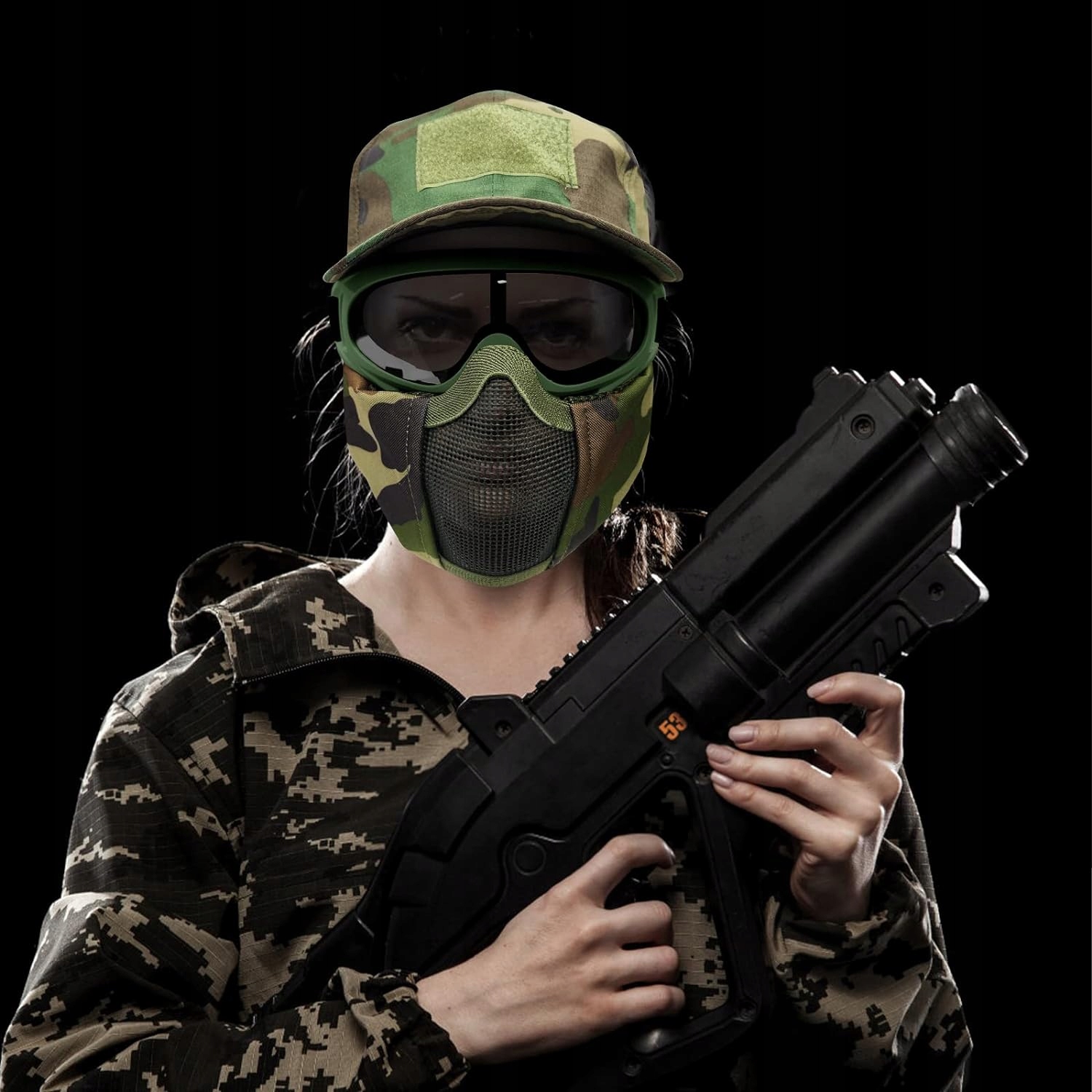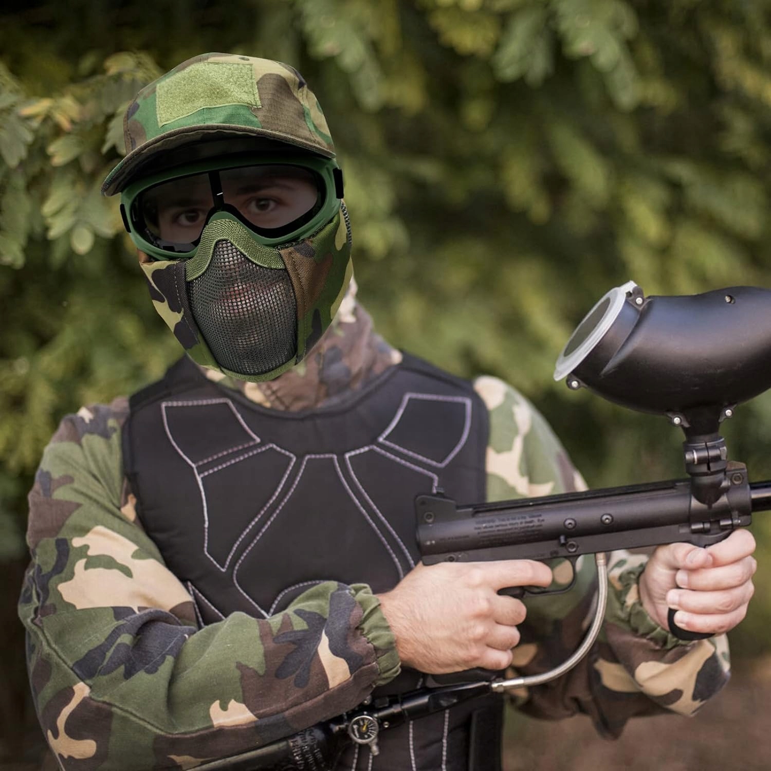 Матеріал Страйкбольна маска з низьковуглецевої сталі та нейлону 1000D, високоякісна та міцна. Окуляри виготовлені з ABS-пластику, сополімеру акрилонітрилу-бутадієну-стиролу, стійкі до ударів і можуть забезпечити достатній захист для публіки зі швидкістю нижче 310 fps на відстані 5 метрів. Бейсбольна кепка з липким кільцем, в комплекті є 1 шт. Цей продукт являє собою повний набір аксесуарів для захисту голови для ігор із пневматичною зброєю. Зручні та регульовані, на масці є 2 регульовані еластичні ремені, які підходять для різних розмірів голови. Страйкбольну сітчасту маску можна злегка зігнути для кращого прилягання до обличчя, що не лише добре захищає ніс та очі, а й полегшує дихання