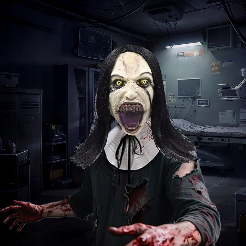 ПОВНА ПІДТВЕРДЖЕННЯ: латексна маска на всю голову із зображенням демонічної жіночої привиди зі спотвореним обличчям, відкритим ротом і розпущеним волоссям. Ефект надзвичайно реалістичний і жахливий з усіх боків!