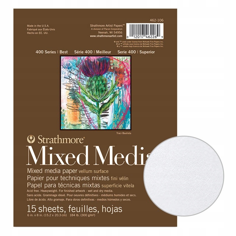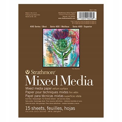400 Series Mixed Media Pad – блок від бренду Strathmore. 15 аркушів натурального білого кольору. Розмір: 15,2 х 20,3 см, вага: 300 г.