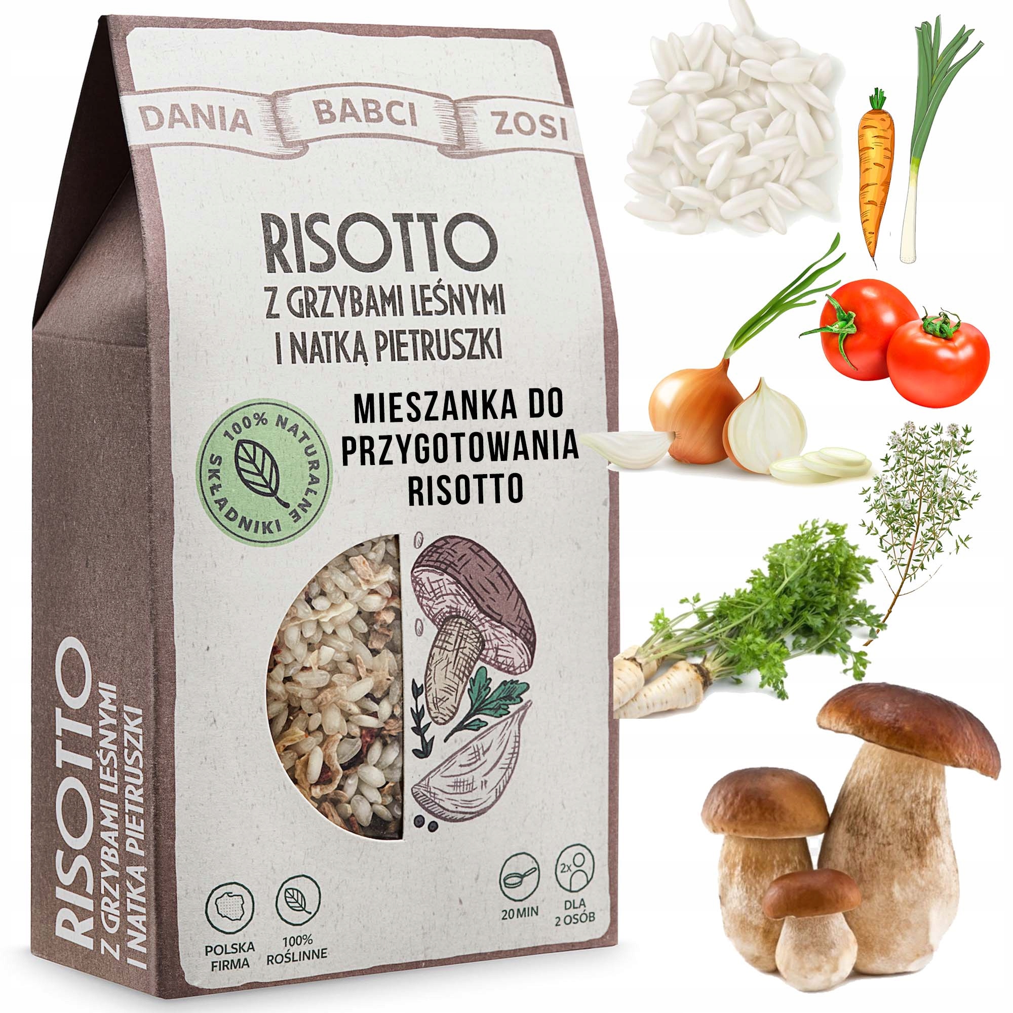 Рис арборіо 82%, сушені гриби 4% (біла, підберезник, маслюк, підосичник), дріжджі пластівці, сушена цибуля, сушені овочі (морква, пастернак, цибуля-порей, петрушка, СЕЛЕРЕЙ, любисток), морська сіль, сушені помідори, сушений часник, чебрець.