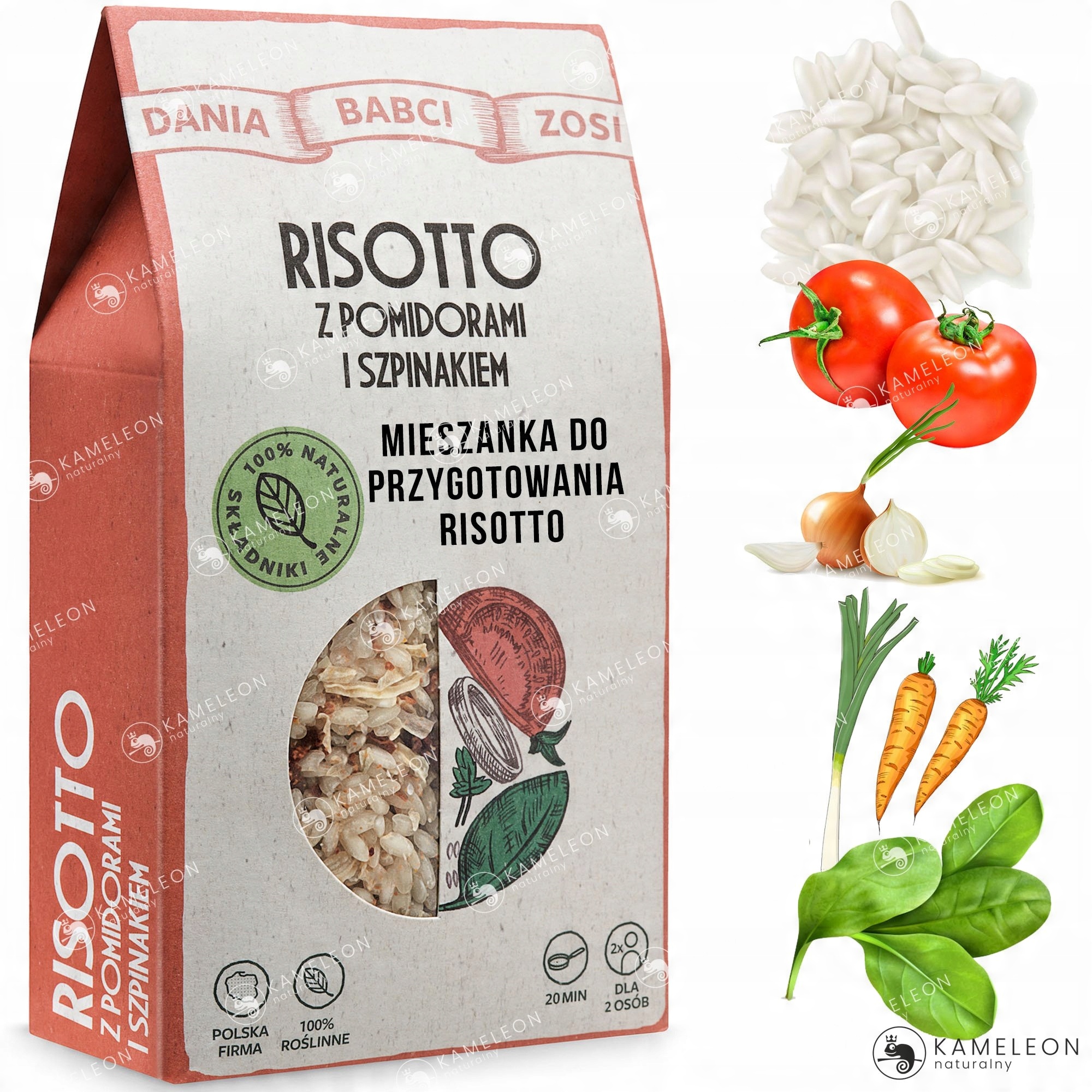 Рис арборіо 82%, сушені помідори 5,5%, сушена цибуля, дріжджові пластівці, сушені овочі (морква, пастернак, цибуля-порей, петрушка, СЕЛЕРА, любисток), морська сіль, сушений шпинат 1,1%, сушений часник, сушений любисток, перець чилі