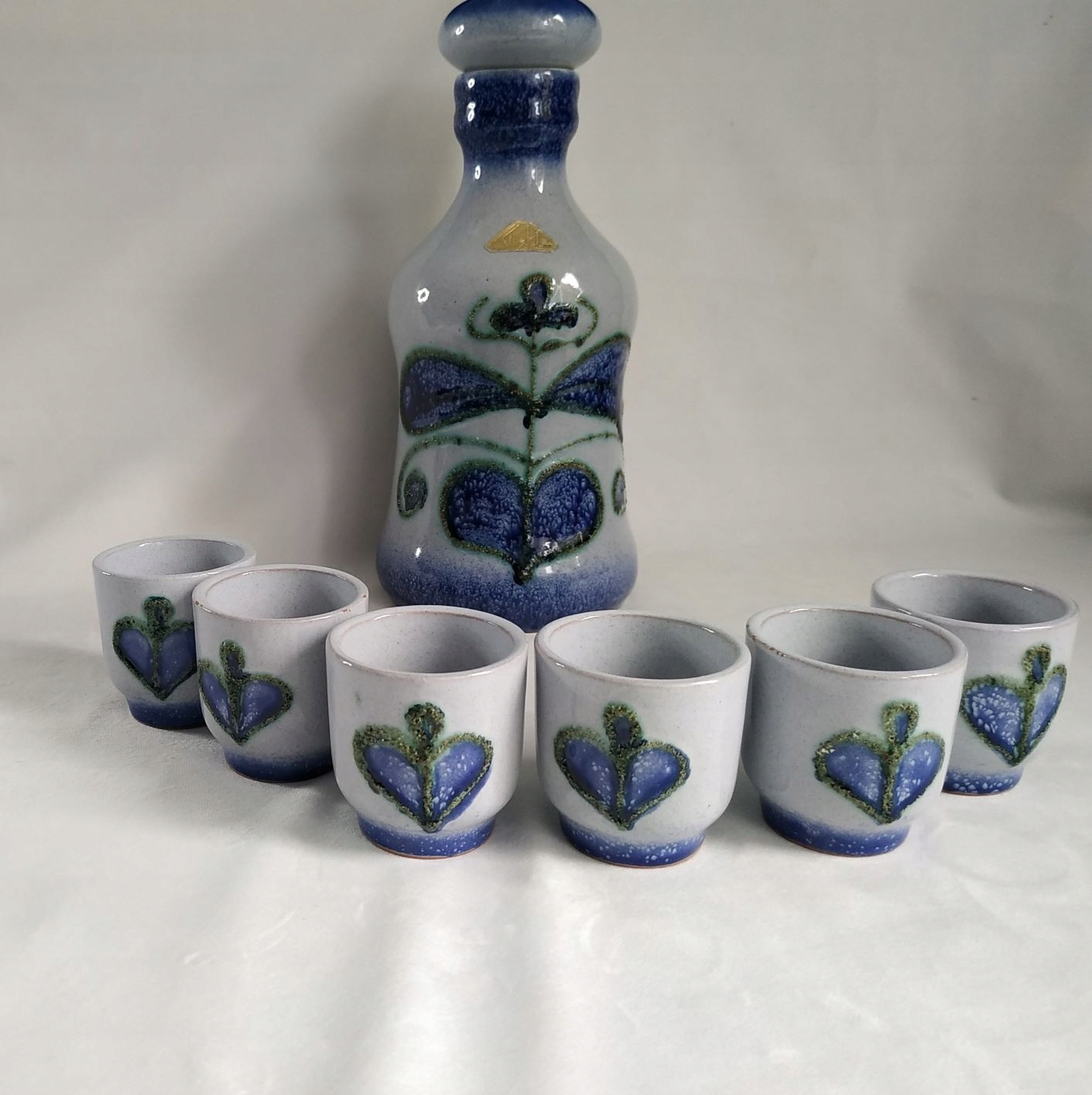 Оригінальний набір 1970-х років - график з пробкою та шість склянок фірми Strehla Keramik (НДР). Виготовлений із кераміки з глазурованою лавовою глазур’ю, типової для сучасного періоду середини століття.