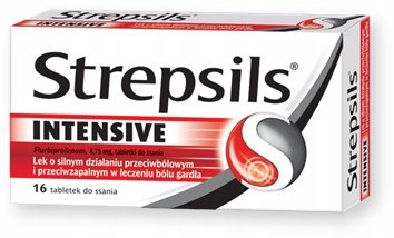 Стрепсілс Інтенсив містить флурбіпрофен – речовину, яка має сильну знеболюючу та протизапальну дію при лікуванні ангіни.