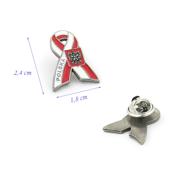 Значок у вигляді шпильки із зображенням польського прапора у формі червоно-білої стрічки з, крім напису Poland, маленьким орлом.