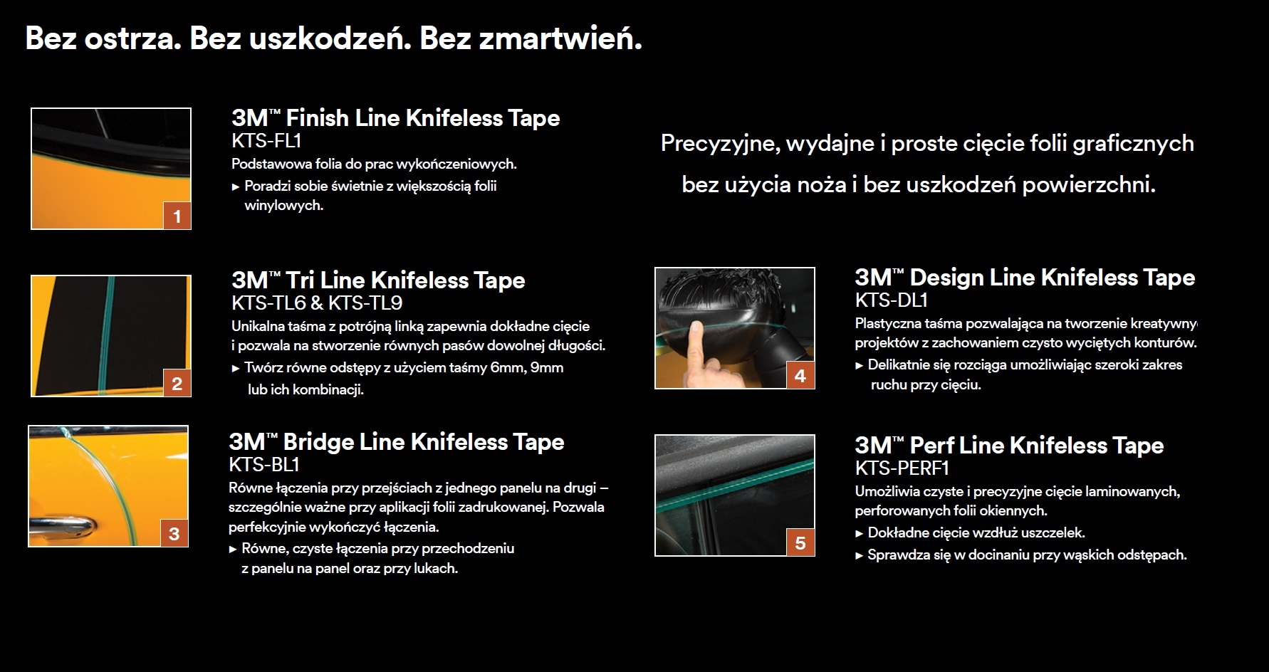 Унікальна ріжуча стрічка з трьома гнучкими венами , що дозволяє точне різання тонких ременів і рівних розривів на фользі автомобіля. Спайки на організмі - без ризику пошкодження лаку.