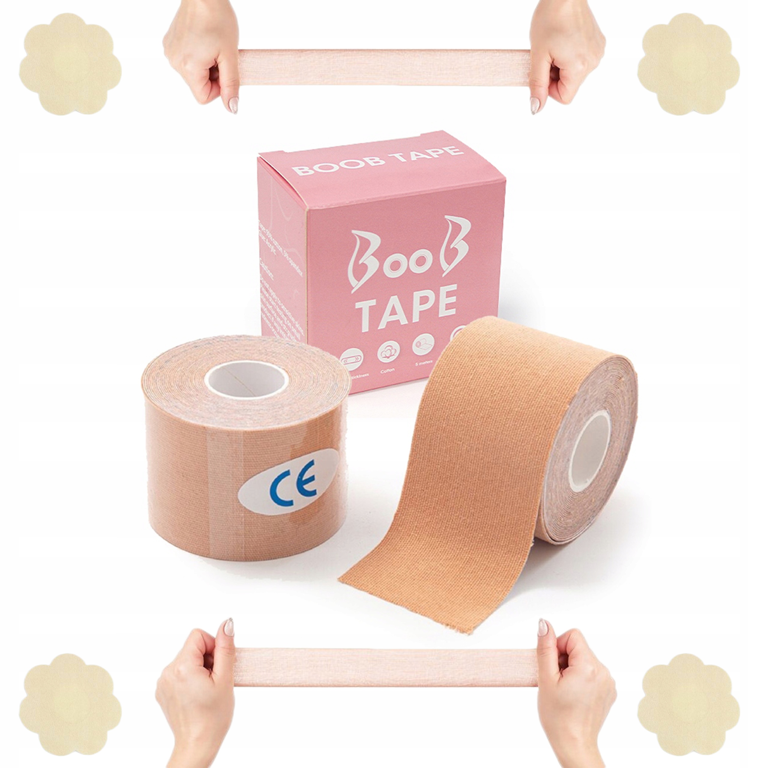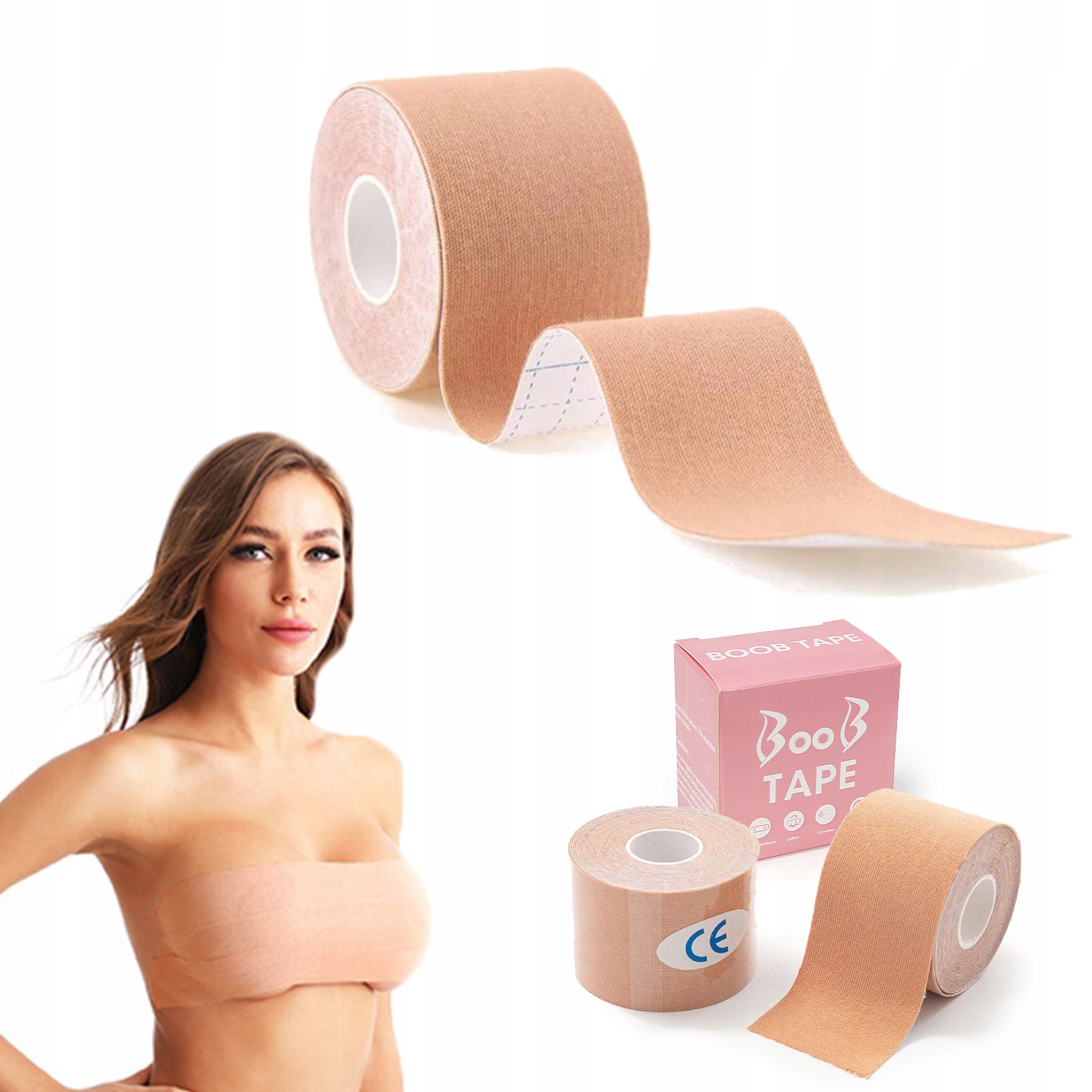 Стрічка Boob Tape ідеально підходить для одягу, у якому не можна носити бюстгальтер. Вона розтягується до 180%, що робить її дуже ефективною та забезпечує максимальне підняття та підтримувати. З його допомогою можна сформувати бюст декількома способами, що дозволяє носити одяг з нерівними вирізами, водночас дуже зручним у використанні. Стрічка водонепроникна, тому нам не потрібно хвилюватися, що вона зісковзне зі шкіри. Ми рекомендуємо використовувати щитки для сосків.