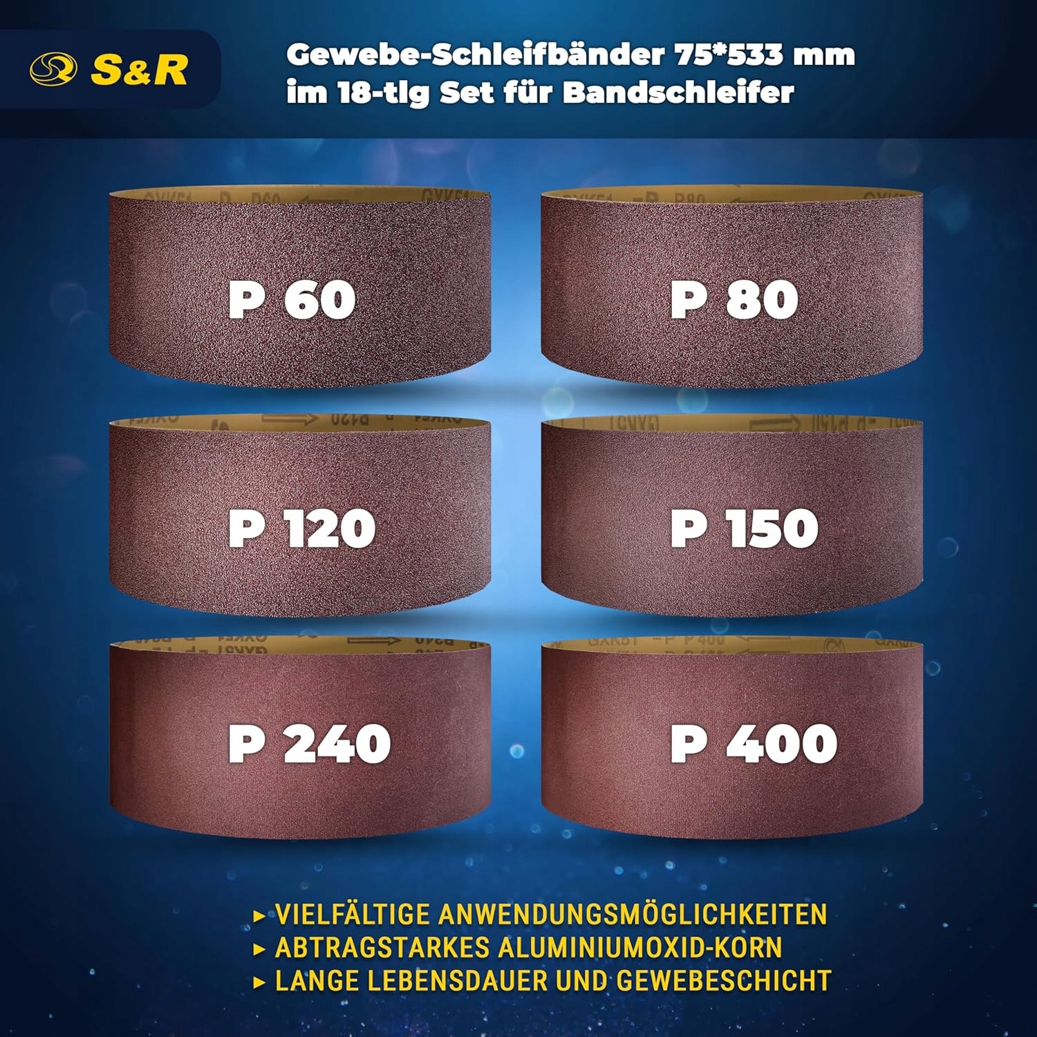 S&R безсоромний пояс, стрічка 75 х 533 мм для стрічкової шліфування. Набір шліфувальних стрічок 18 штук, шліфувальні стрічки 75 х 533 мм, шліфувальні стрічки кожні 3 шт.