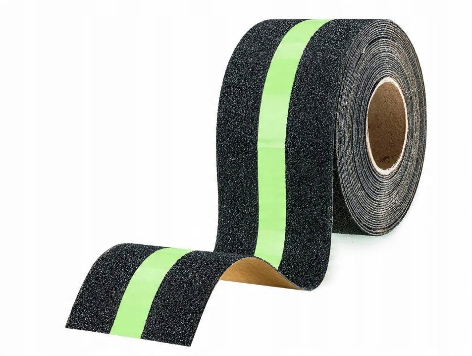 Самоклеюча антиковзаюча стрічка з протиковзкого матеріалу, який важко стирається. Посередині є смужка з флуоресцентною фарбою, яка світиться вночі