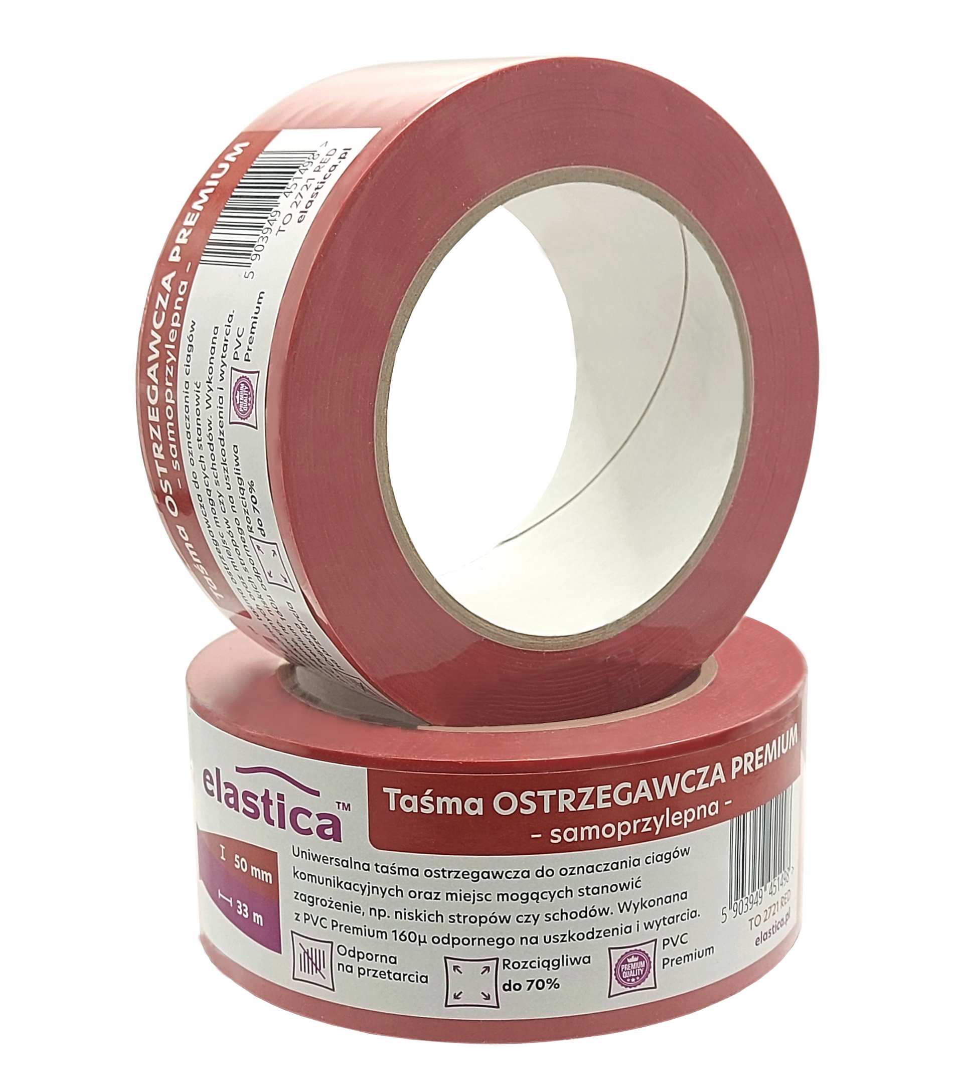 Стрічка Попереджувальна стрічка Elastica PREMIUM PVC 50мм/33мвиготовлена з ПВХ, що робить її стійкою до пошкоджень і стирання. Завдяки використанню натурального клею Solvent добре зчіплюється з різними типами поверхонь, що полегшує нанесення. Додатковий захист від розриву забезпечує його спеціальна розтяжність до 70 відсотків.