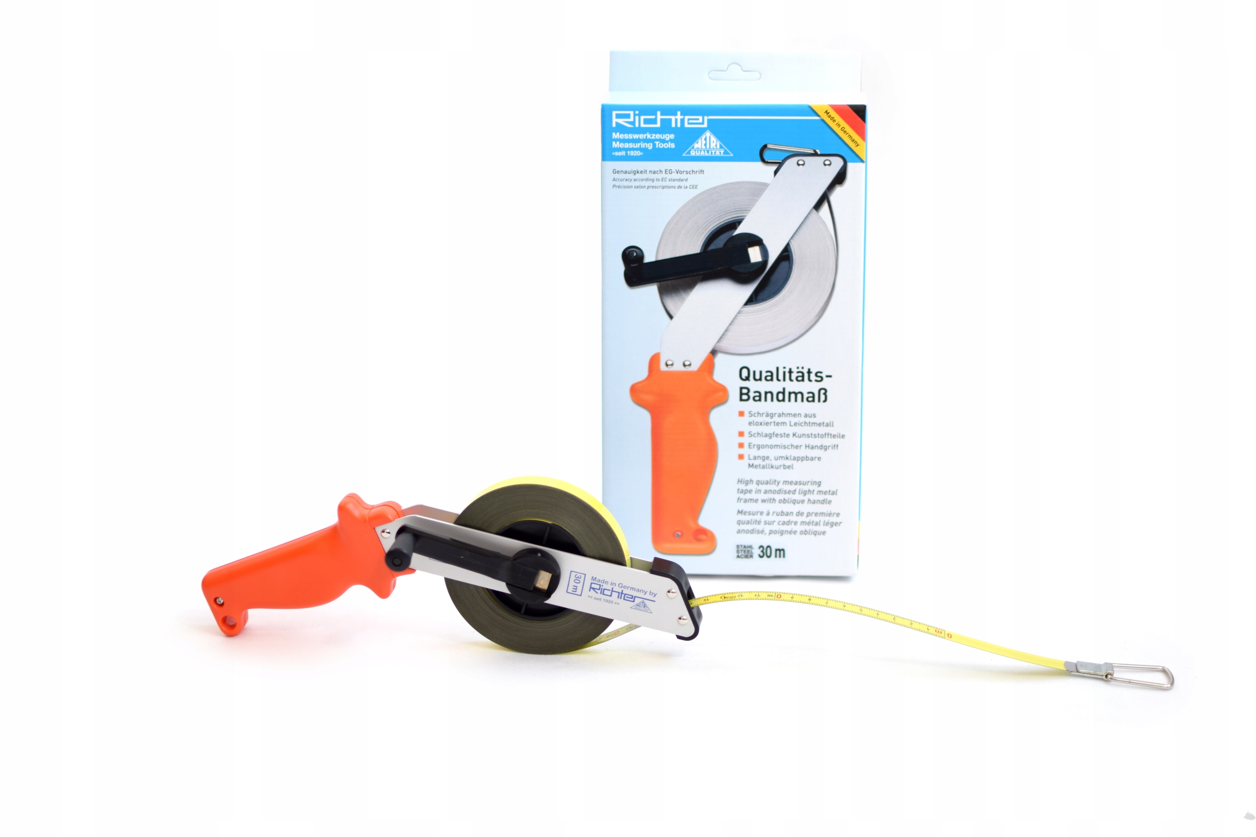 Сталева стрічка німецької компанії RICHTER, виготовлена з міцного та корозійностійкого сталевого сплаву. Ергономічна рукоятка з високоякісного матеріалу надійно лежить у ваших руках. Складна ручка для швидкого перемотування, заклепана, ударостійка конструкція. Сталь покрита жовтим лаком для захисту від корозії, рама з легкого анодованого алюмінієвого сплаву.