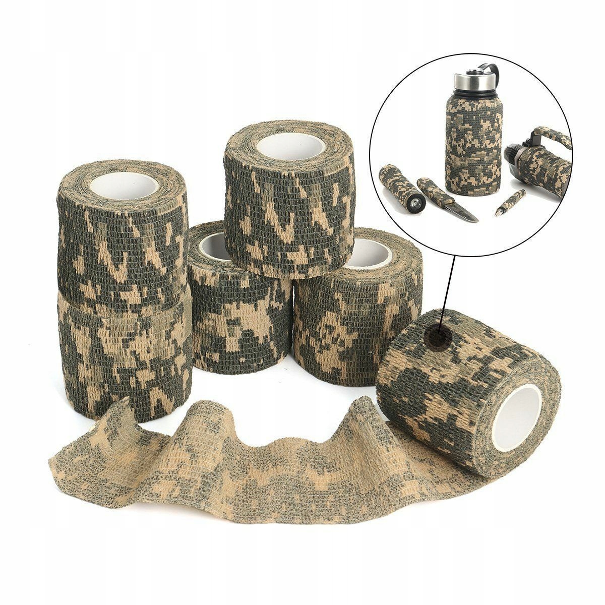 Високоякісна камуфляжна стрічка, призначена для маскування такого обладнання, як біноклі, підзорні труби, фотоапарати, зброя тощо. Ідеально маскує елементи. виготовлено з високоякісної самоклеючої бавовни, що означає, що він приклеюється лише сам до себе, не залишаючи клею на маскованому обладнанні