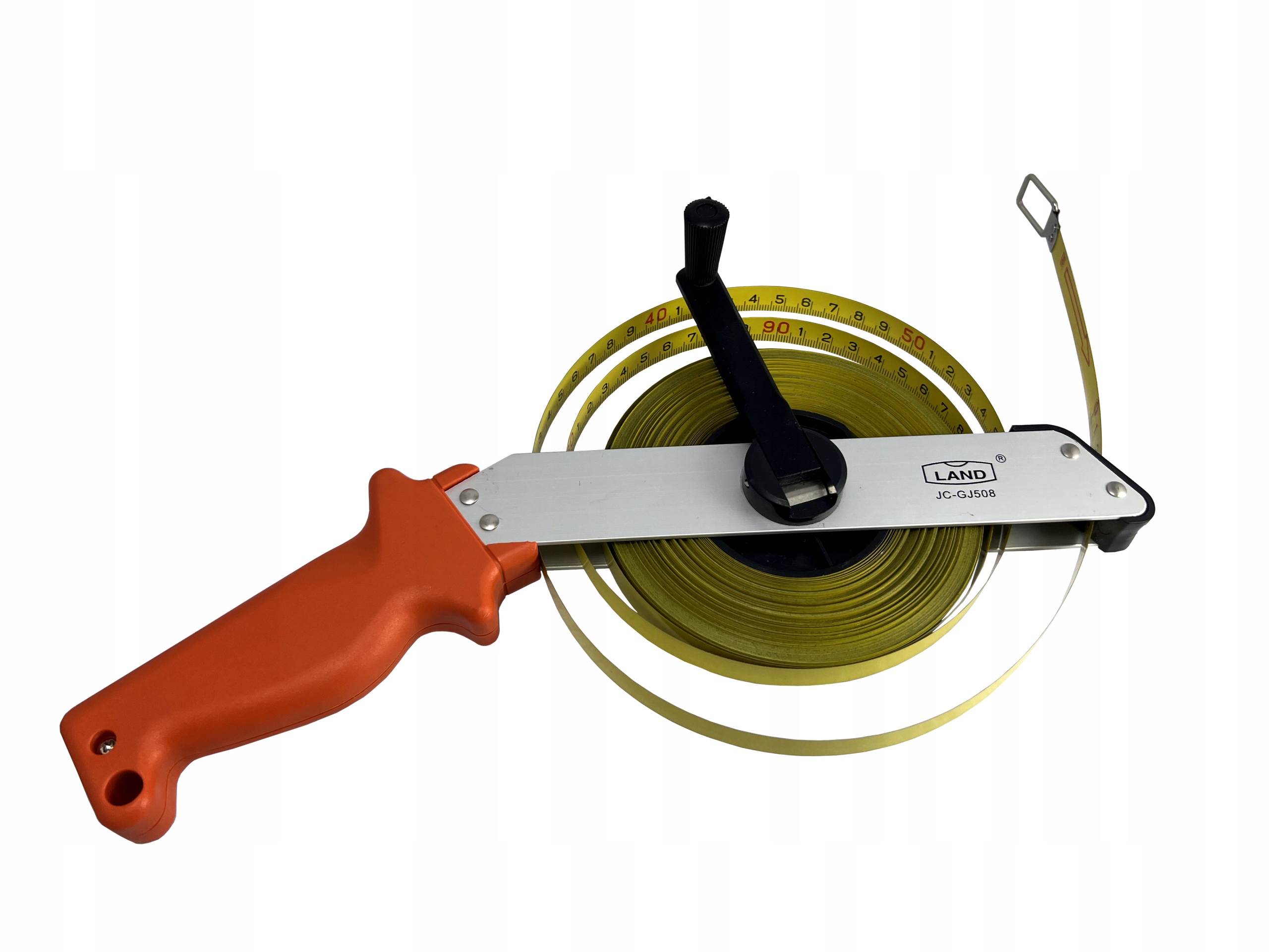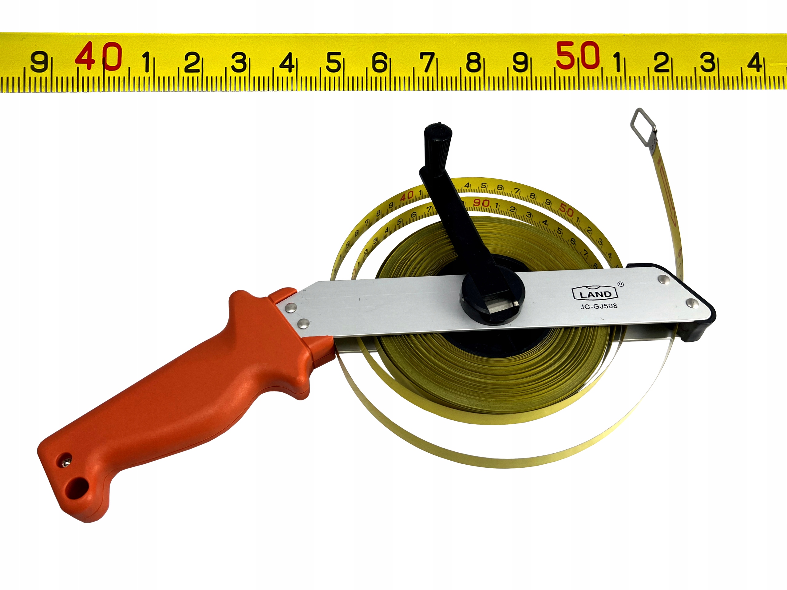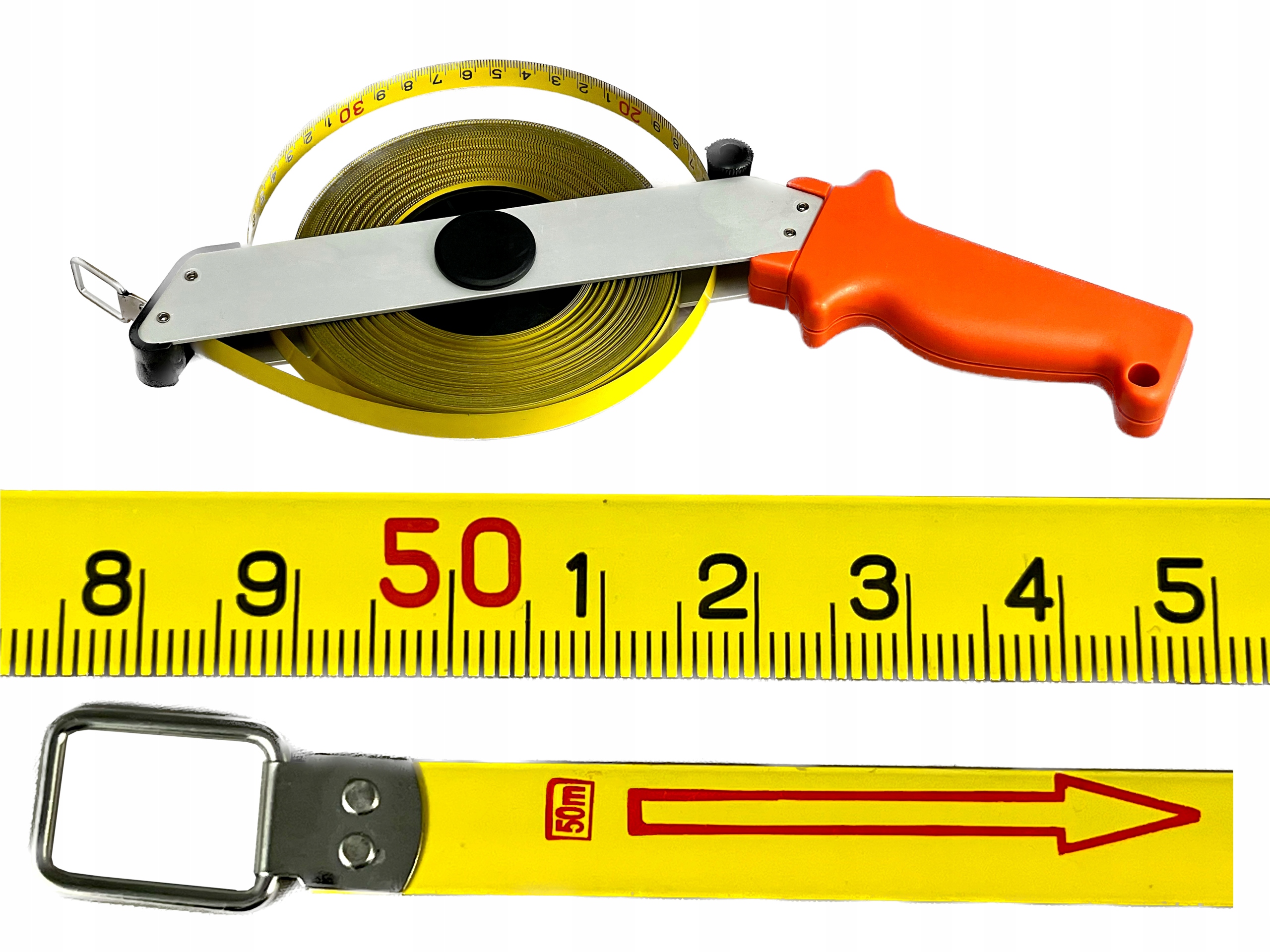 Має прозору чорну міліметрову шкалу з червоними позначками через кожні 10 см. Цей розподіл дозволяє швидко та легко зчитувати вимірювання. Металева котушка оброблена пластиковим шатуном, який запобігає розтягуванню стрічки під час транспортування. Рулетка відрізняється легкою, стійкою алюмінієвою рамою, яка фіксує стрічку. Має ручку ергономічної форми з помаранчевого пластику.