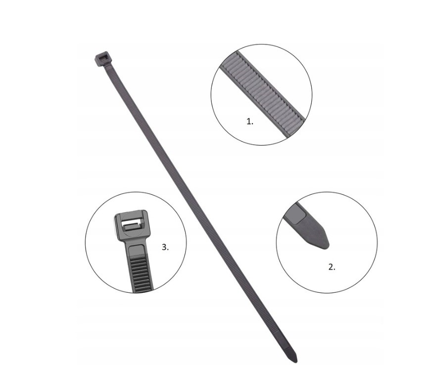 Самозамикаючий замок стрічки міцний і довговічний. По всій довжині стрічки є зубці, що дозволяє точно регулювати розмір петлі відповідно до ваших індивідуальних потреб. Кабельні стяжки дуже гнучкі та стійкі до високих температур.