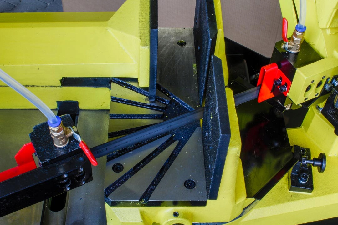 Стрічкова пила для металу ( з CE) дозволяє як перпендикулярне різання, так і різання під будь-яким кутом, діапазон якого становить від -45 до +60 градусів. Вирізаний елемент можна подавати вручну або автоматично за допомогою будь-якого пристрою подачі. Подача при різанні здійснюється за допомогою гідроциліндра.