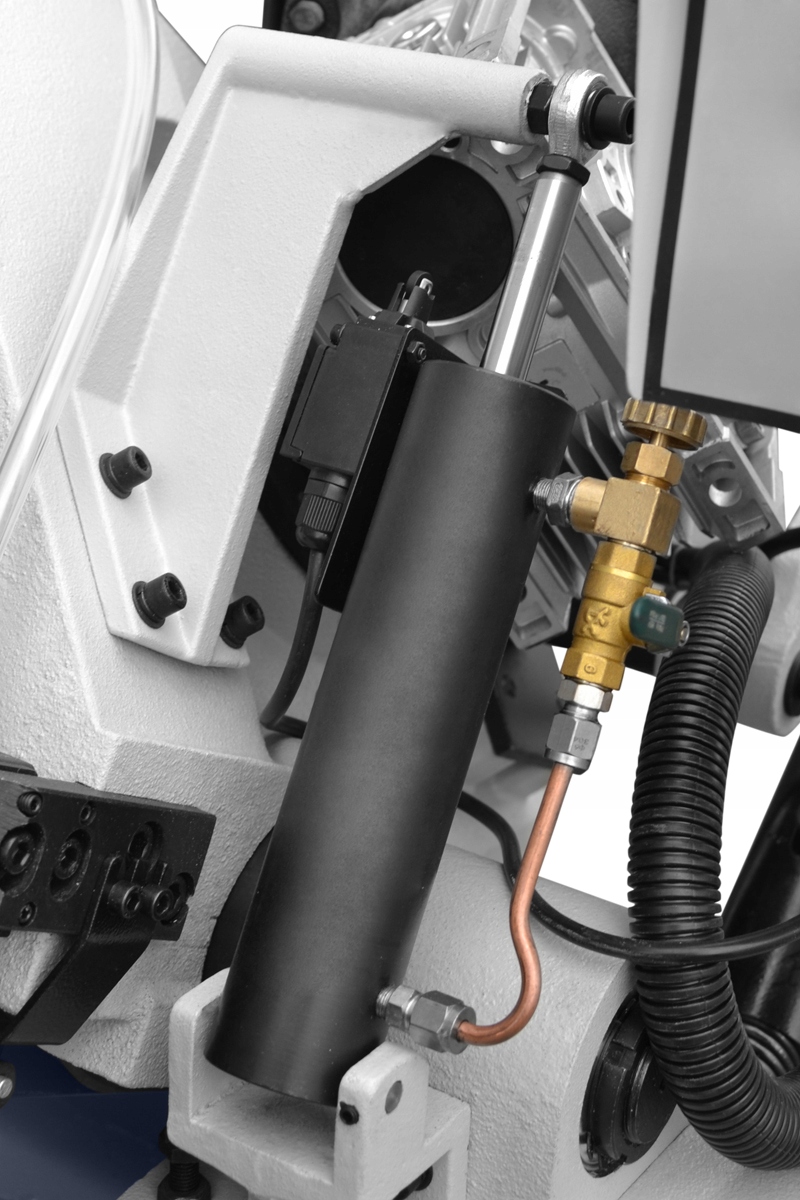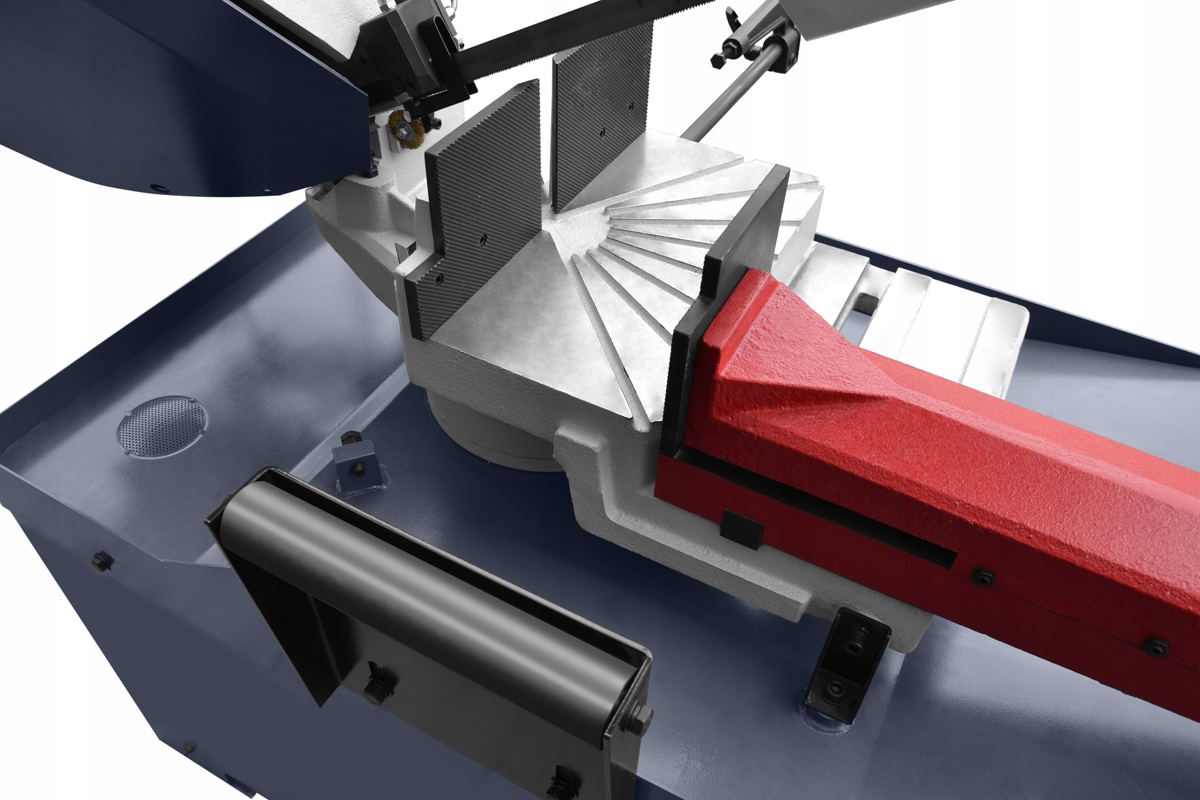 Річка обладнана автоматичним датчиком натягу полотна та нахилена на 25 градусів, що збільшує термін служби пильного полотна. Щітка для чищення прикріплена до нижньої частини кронштейна для забезпечення ідеальної чистоти та функціонування пилкового полотна. Привід машини передається через черв'ячну передачу. Машина має трифазний двигун з двома швидкостями різання і термозахист двигуна. Кутер має ГОДИННИКОВИЙ ТЕНЗИМЕТР - датчик натягу стрічки та автоматичне відключення при обриві ріжучої стрічки.