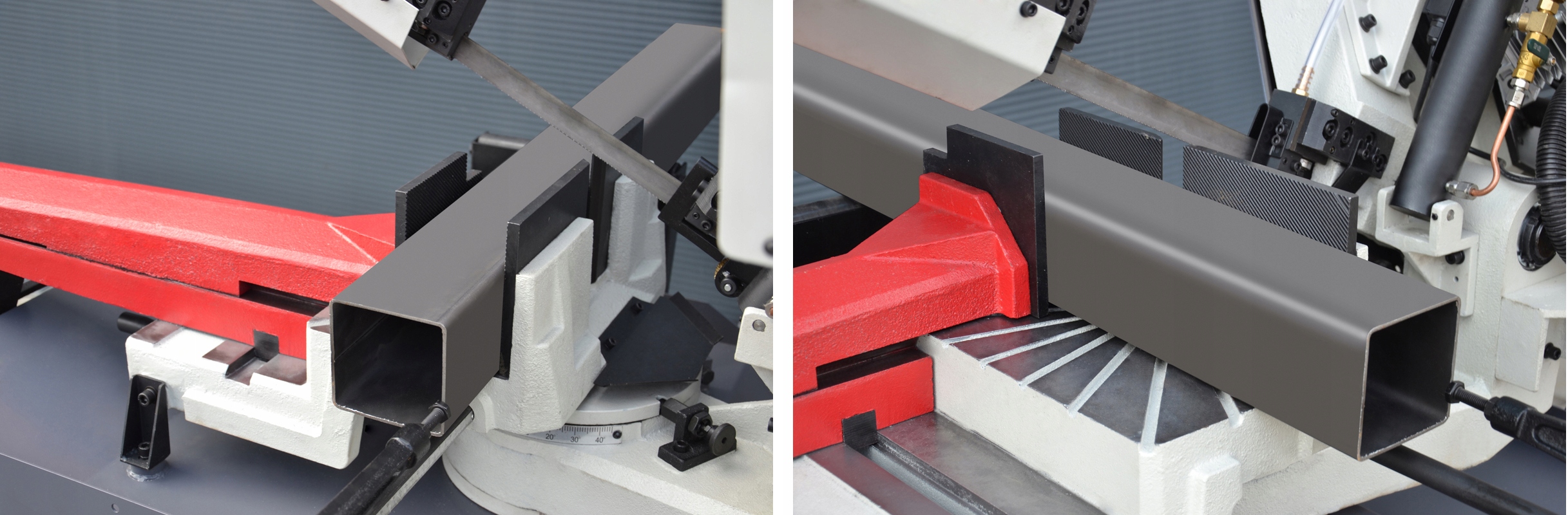 Горизонтальний металевий стрічковий фреза з поворотним кронштейном дозволяє різати в площині, перпендикулярній осі матеріалу, що розрізається, і під будь-яким кутом від -45° до 60°. Розкроюваний матеріал можна подавати вручну або за допомогою будь-якого механічного пристрою, а подача інструменту відбувається автоматично. Стрічкові напрямні оснащені спеціальними твердосплавними пластинами і підшипниками. Це має величезний вплив на напрямок стрічки, її довговічність, прямолінійність, точність і якість різання. Твердосплавне напрямне значно зменшує знос верстата та пилкового полотна. Машина оснащена ефективним насосом охолодження із закритим контуром охолодження.