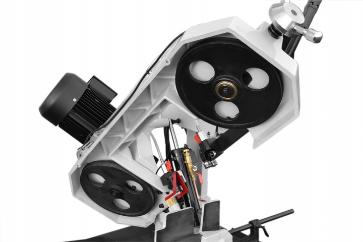 Ріжуча стрічка натягнута на двох чавунних колесах. за допомогою ручного натягувача та проходження через набір роликів із шарикопідшипниками.