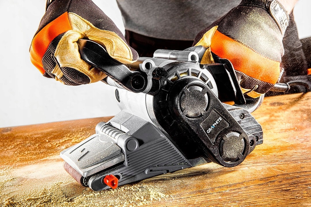 Спеціалізована стрічкова шліфувальна машина GRAPHITE (арт. № 59G392)потужністю 800 Вт призначена для обробки дерев'яних і деревоподібних матеріалів, металу і пластику. Пристрій характеризується ергономічною формою і сучасним дизайном, має протиковзку накладку на основній ручці і додаткову ручку з можливістю швидкого регулювання кута нахилу. Направляючий ролик болгарки виготовлений з алюмінієвого сплаву, стійкого до високих температур і пошкоджень. Невеликий діаметр переднього ролика (16,5 мм) дозволяє шліфувати у важкодоступних місцях. Крім того, пристрій має можливість блокування перемикача безперервної роботи і можливість нахилу кришки нескінченної стрічки. Максимальна швидкість стрічки становить 260 метрів за хвилину. Пристрій оснащений гнучким і міцним кабелем живлення з прогумованим покриттям довжиною 3 метри, який також призначений для професійного та промислового застосування як у приміщенні, так і на вулиці. У комплекті з болгаркою йде мішок для пилу і нескінченна стрічка розміром 75х457 мм. Відповідність європейським стандартам забезпечується сертифікатом CE.
