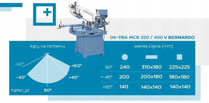 Стрічковий різак MCB 320 ECO BERNARDO - економічний і універсальний різак, який забезпечує великі можливості обробки при відносно невеликих розмірах. Надійна пила універсального призначення за дуже вигідною ціною! Ця стрічкова пила ріже під кутом в діапазоні від -45° до +60° > - з поворотним кронштейном, опущеним на гідроциліндр і системою охолодження. Розмір різання до 240 мм (плоско 310x180 мм).