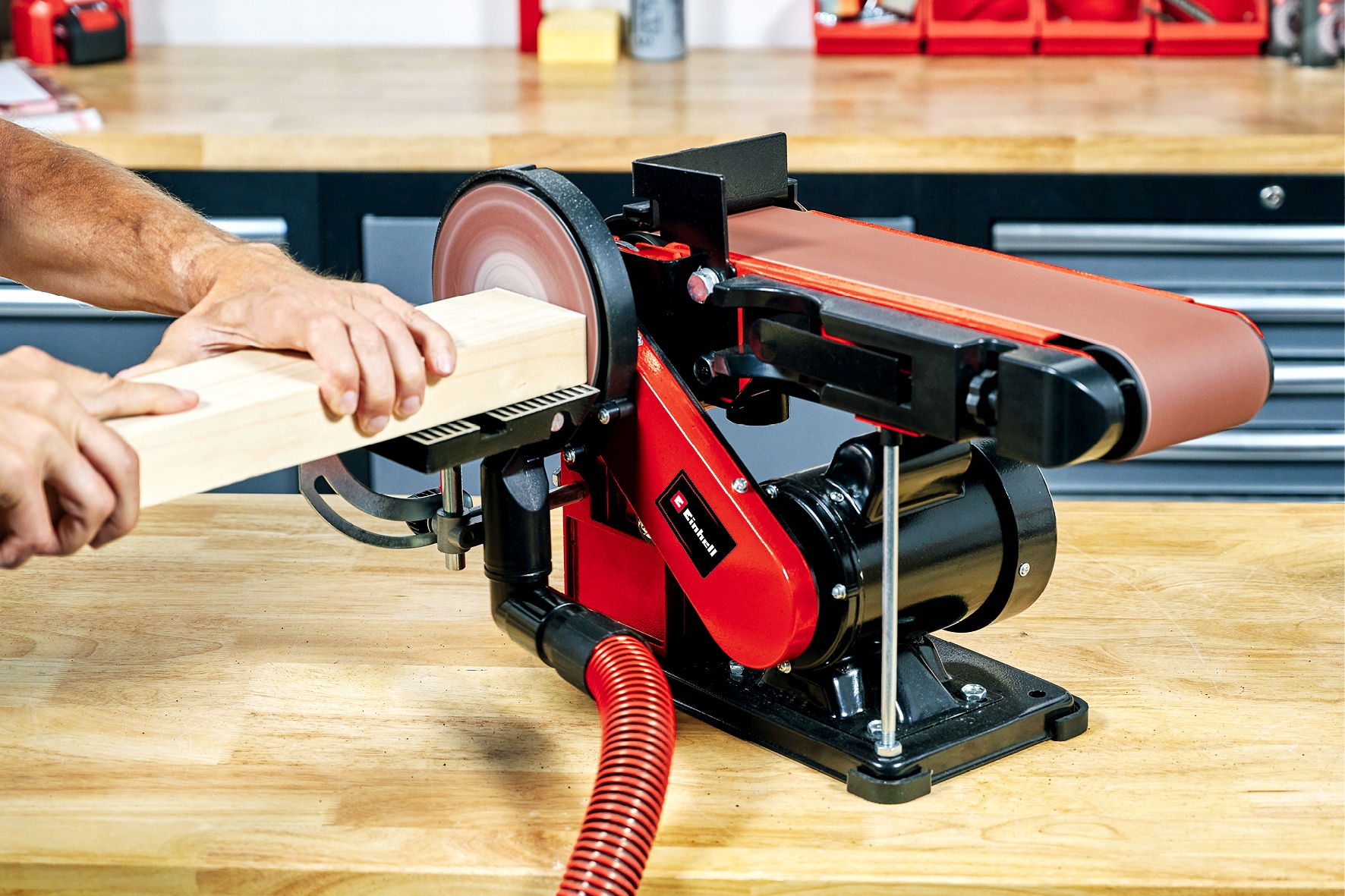 - Стрічковий шліфувальний верстат - це інструмент потужністю 380 Вт з функцієюстрічкового шліфування > та диск, оснащений ротаційним шліфувальним пристроєм з упором заготовки.