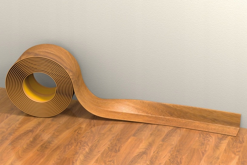 - Самоклеючий плінтус використовується для оздоблення підлог, покритих ковроліном ПВХ або підлоговими панелями. Він може покривати важкодоступні місця та маскувати нерівності.