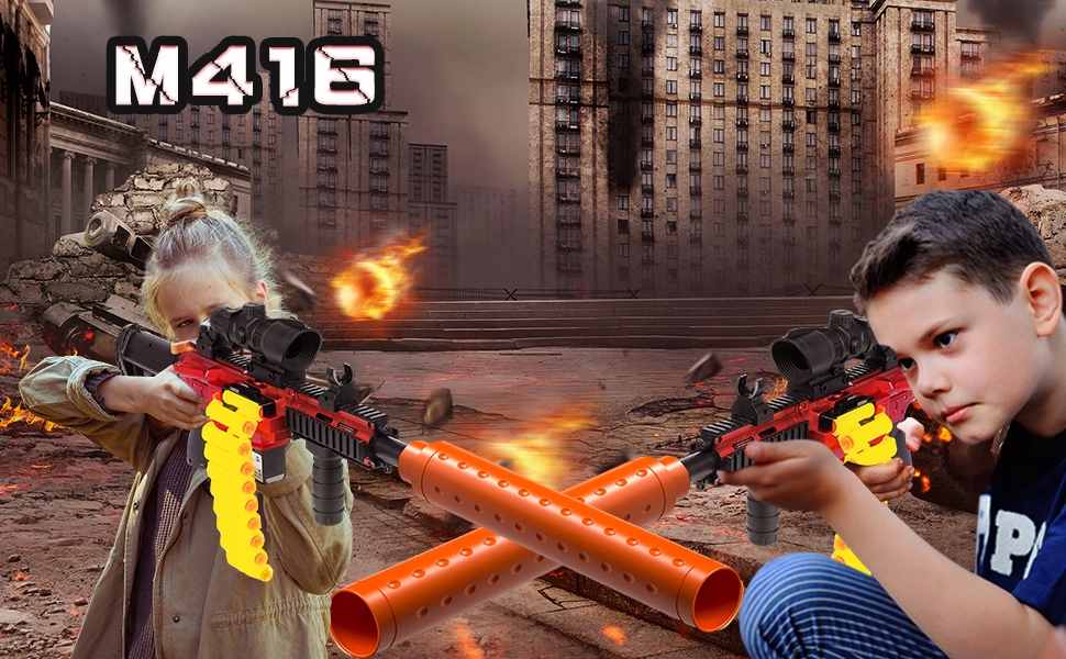 - Пускомет М416 призначений для дітей і початківців і може стріляти пінними снарядами. Корпус виготовлений з міцного пластику і підходить для гри всім дітям, не завдаючи травм. Вашому синові чи дочці сподобається цей подарунок, і не хвилюйтеся, що ви купили його неправильно, він містить інструкції зі збирання, і він чудово підходить для дітей, щоб насолоджуватися найреалістичнішою грою-стріляниною вдома чи в саду!