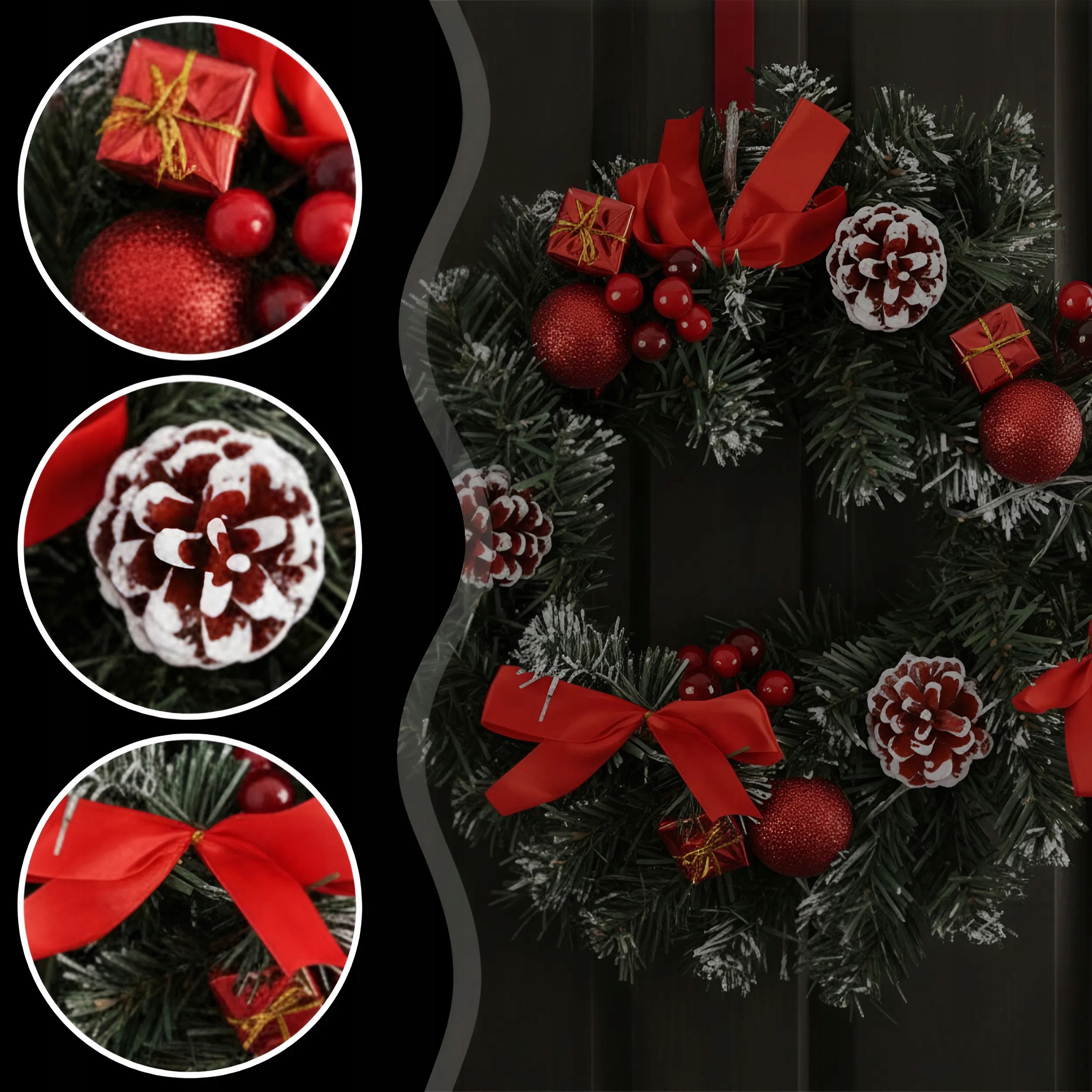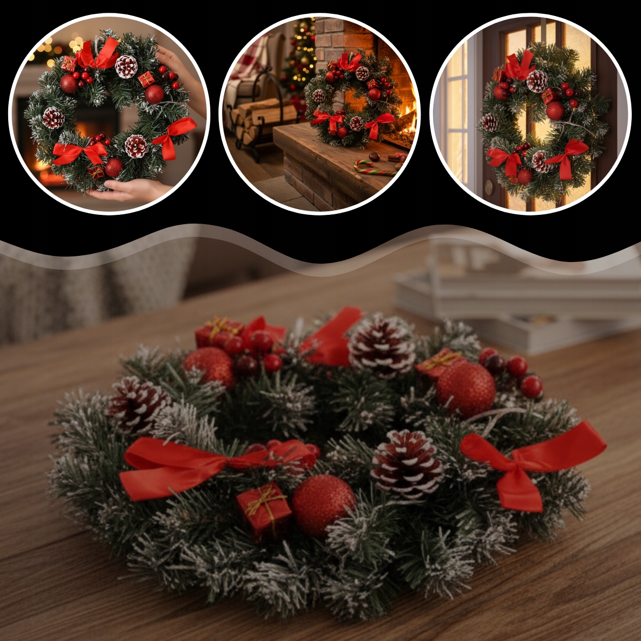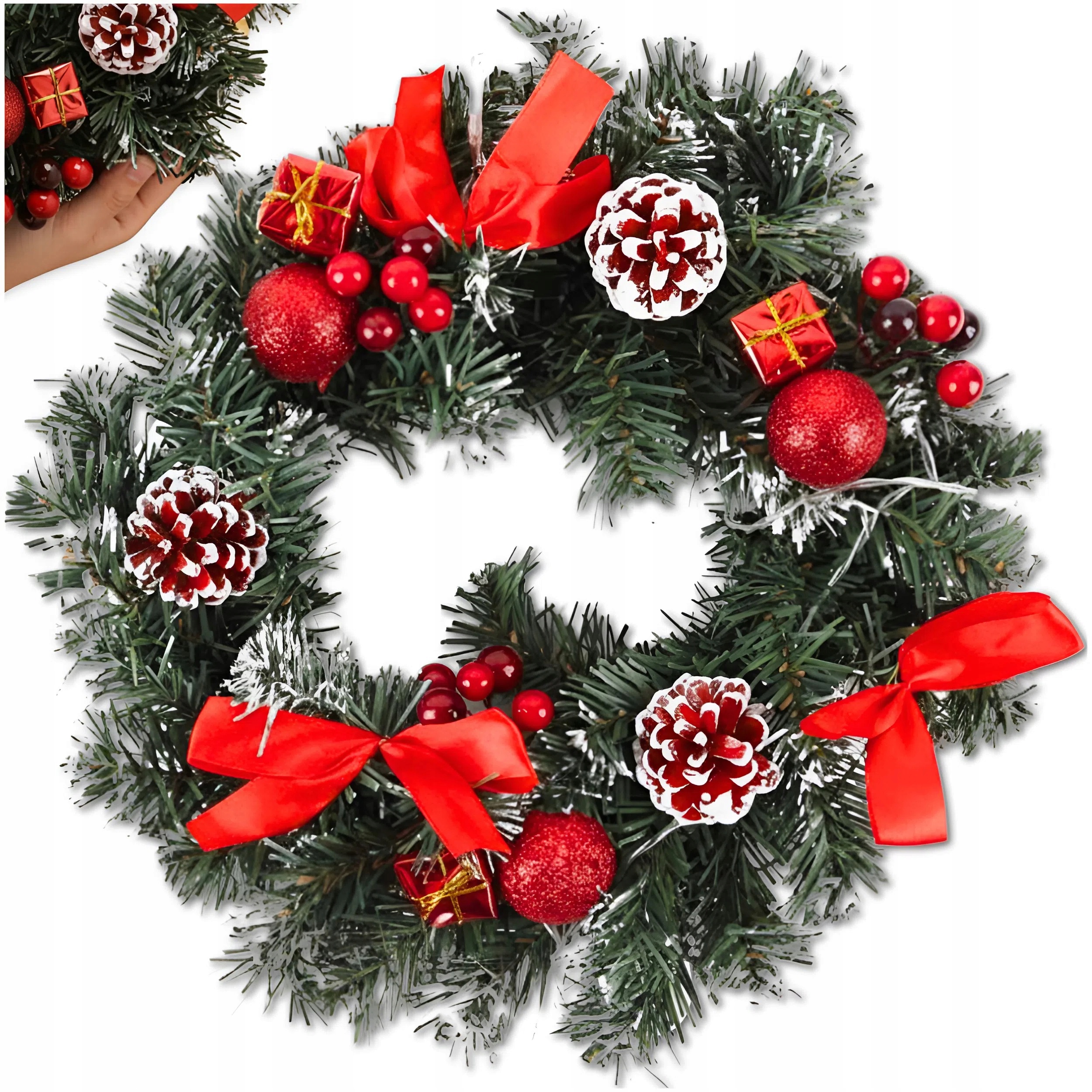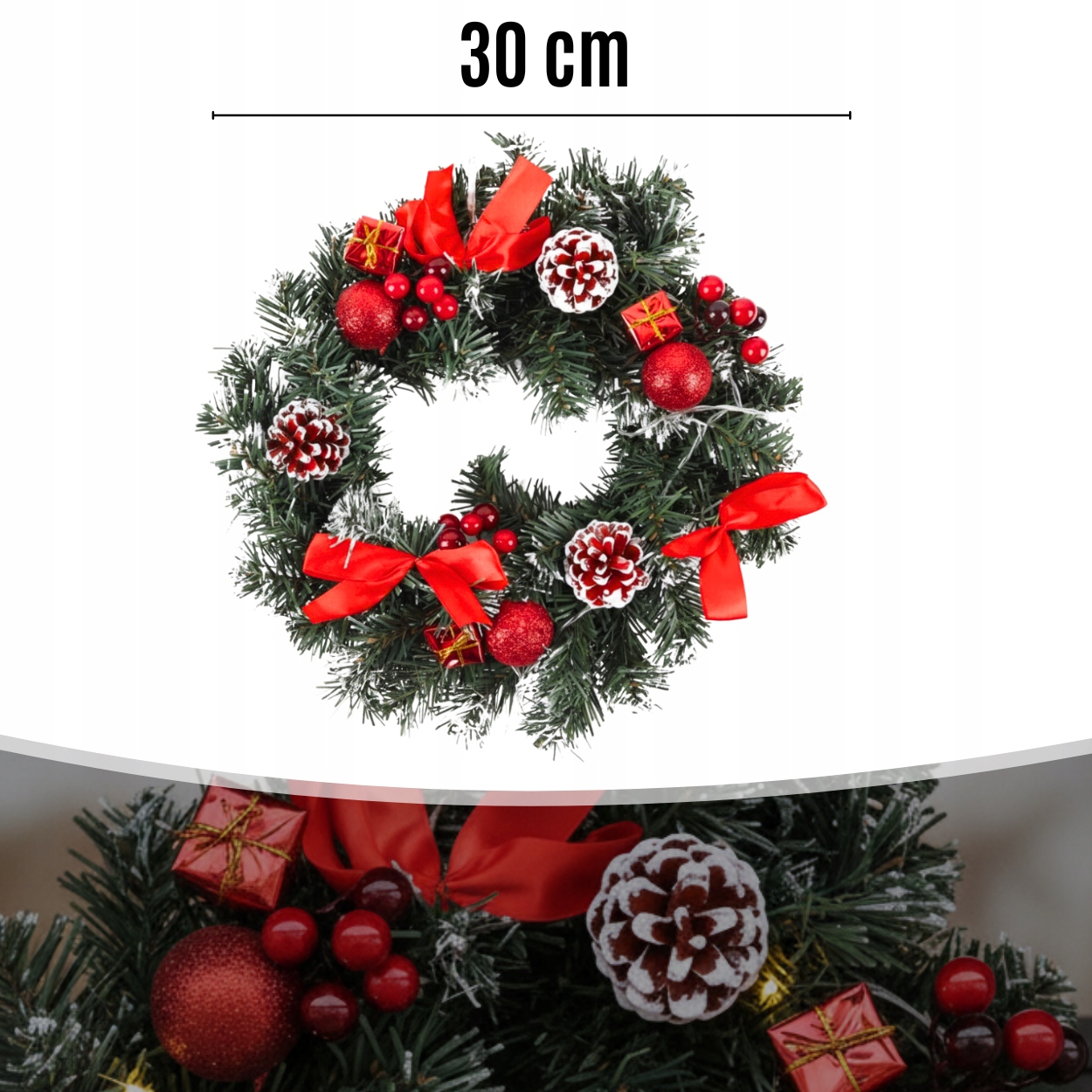Цей чарівний різдвяний вінок діаметром 30 см ідеально підходить для прикраси дверей, стіни чи столу. Зроблена з щільних, зелених гілочок, прикрашена червоними фенечками, бантами та шишками, вона привнесе в інтер'єр чарівний, різдвяний настрій.