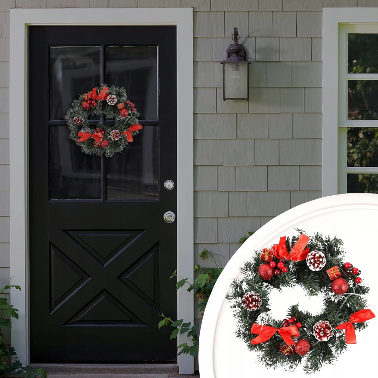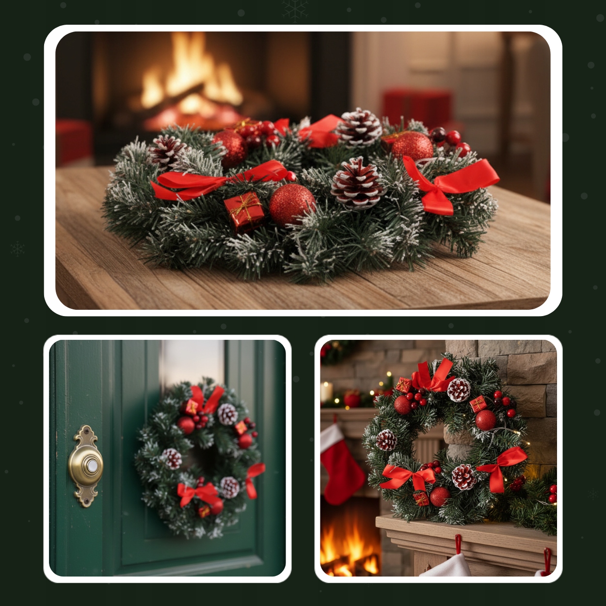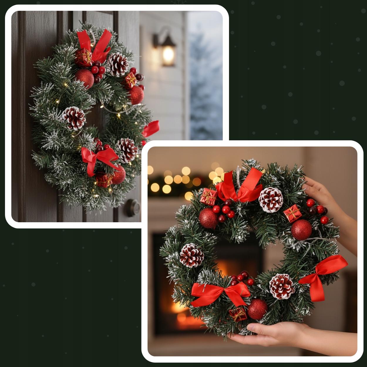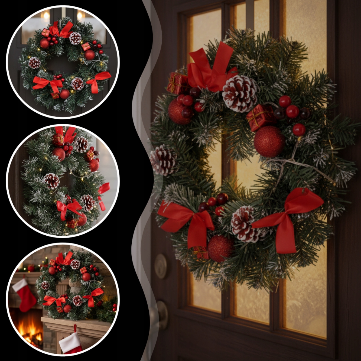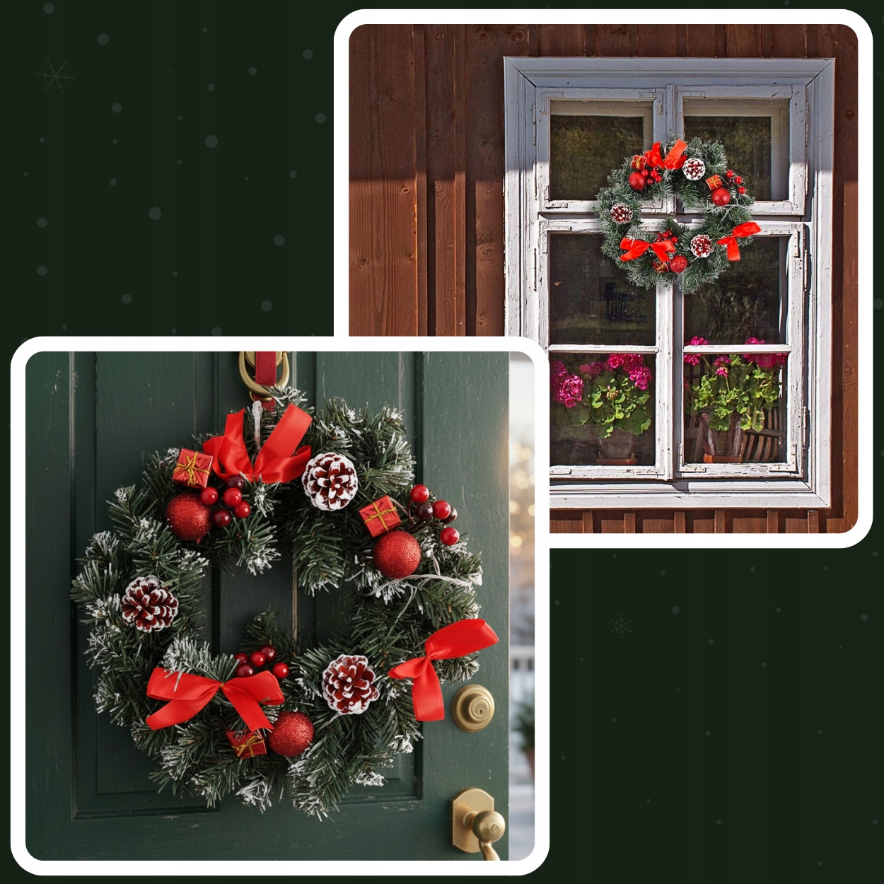 Цей чарівний різдвяний вінок діаметром 30 см ідеально підходить для прикраси дверей, стіни чи столу. Зроблена з щільних, зелених гілочок, прикрашена червоними фенечками, бантами та шишками, вона привнесе в інтер'єр чарівний, різдвяний настрій.