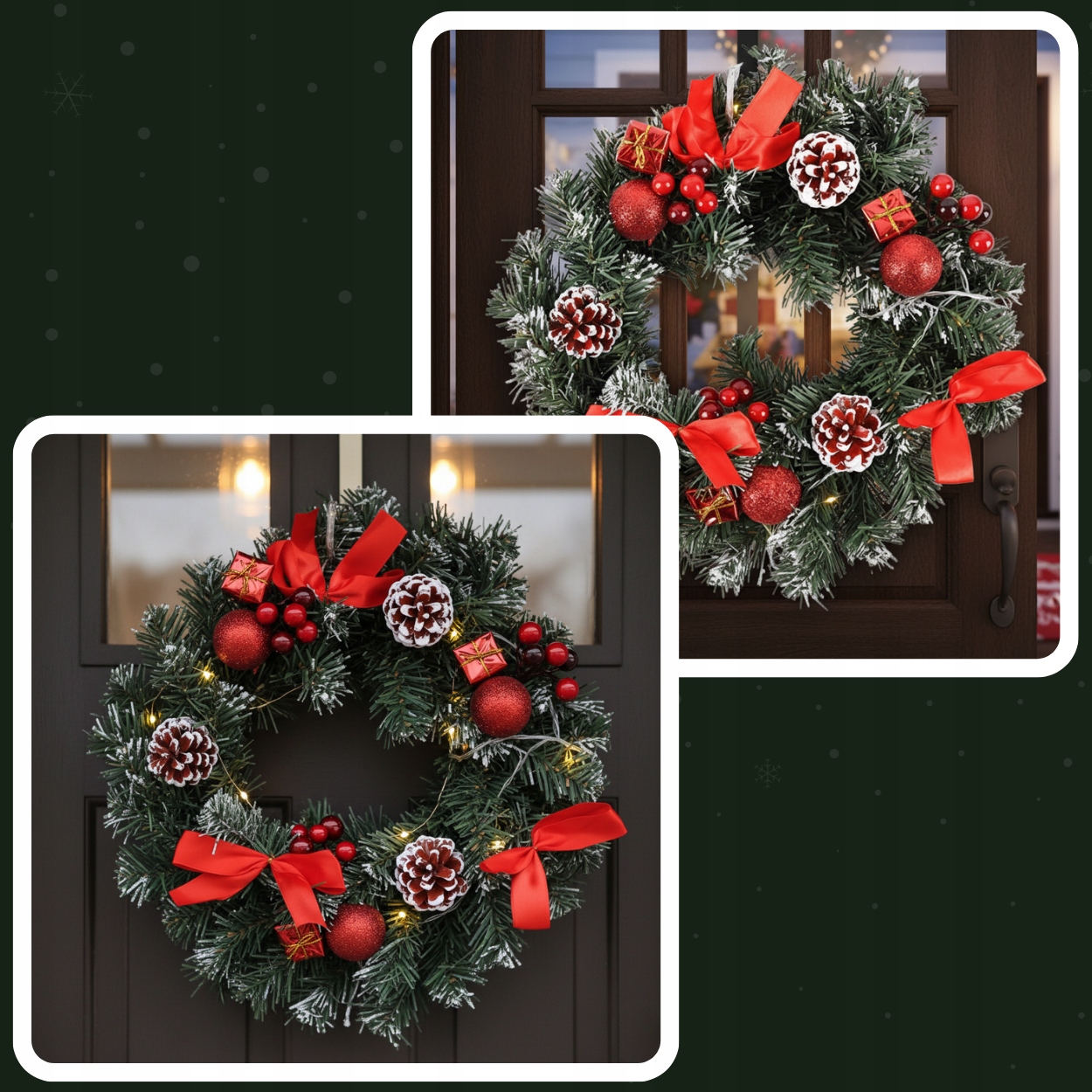 ➡️ БАНТИ З ЧЕРВОНОЇ СТРІЧКИ - м'який матеріал та інтенсивний колір роблять вінок ефектним як на дверях, так і у вітальні. Це символ елегантності та радості Різдва.