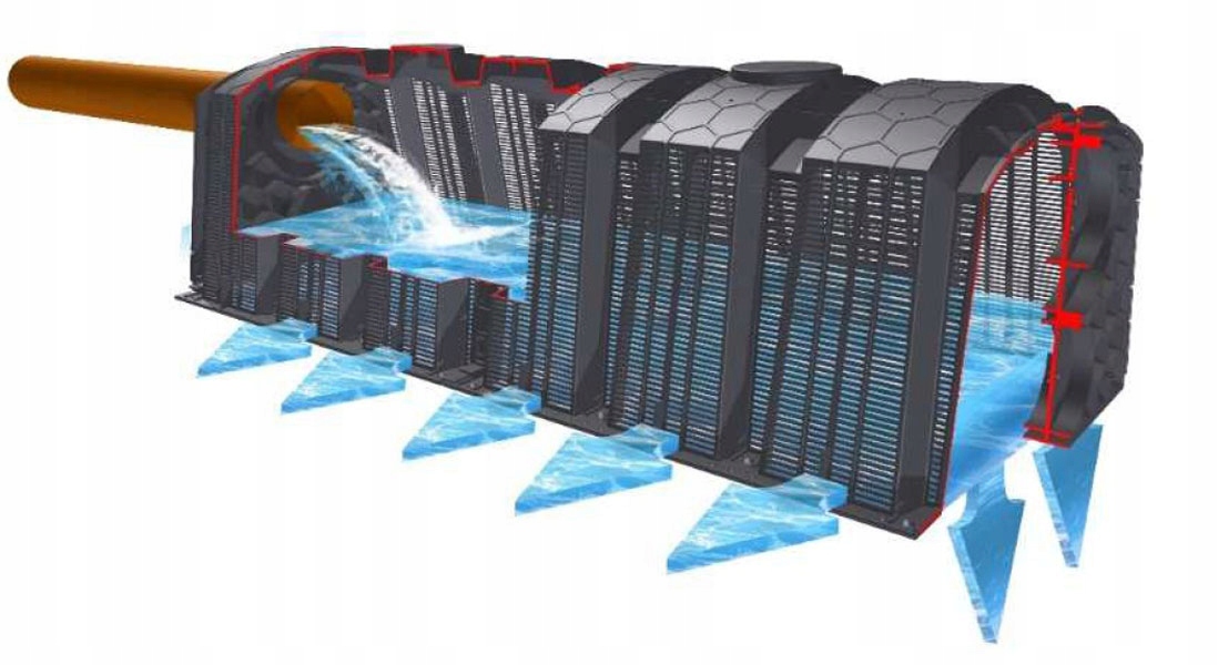 Домашні екологічні очисні споруди з інфільтраційною системою призначені для очищення побутових стоків на територіях без каналізаційних систем і успішно замінюють септики. Відстійник з PEHD, виготовлений за технологією ротаційного формування, що гарантує високу якість і стійкість матеріалу до агресивних речовин, таких як стічні води. Відстійник має один димохід, призначений для спорожнення і в якому розміщений фільтр, щоб запобігти потраплянню суспензії та осаду в систему інфільтрації (дренаж або тунелі). Очищення стічних вод відбувається двома послідовними процесами. Резервуар утримує грубі стічні води та жири шляхом відстоювання в процесі анаеробних бактерій, потім течуть лише рідкі стічні води, які потім очищаються в аеробному процесі в фільтраційному дренажі. Осадження відбувається в резервуарі очисних споруд (відділення густих стічних вод і відділення жирів). Параметри стічних вод після проходження цих процесів відповідають нормам Польщі та ЄС. Тунельний дренаж влаштований в одну або дві паралельні лінії з вентиляційними отворами в кінці кожної для циркуляції кисню. Характеризується невеликою площею розробки, простотою установки та гнучкістю вибору. При виборі дренажу ми припускаємо 1-2 тунелі на людину з добре дренованим ґрунтом.