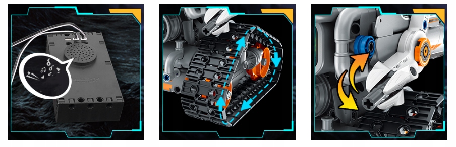 - Це також створює чарівні звукові ефекти. 4 Роботи, , включаючи настінні роботи, механічну сови та екскаватор .